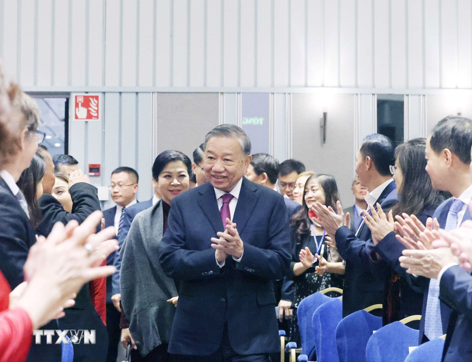 Tổng Bí thư Tô Lâm và Phu nhân gặp gỡ cán bộ Đại sứ quán Việt Nam và cộng đồng người Việt tại Bắc Âu. (Ảnh: Thống Nhất/TTXVN)