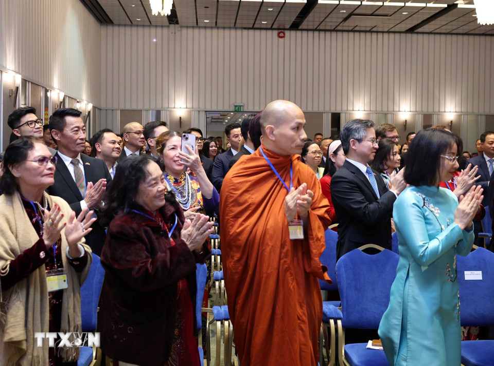 Cán bộ Đại sứ quán Việt Nam tại Phần Lan và cộng đồng người Việt tại Bắc Âu mừng đón Tổng Bí thư Tô Lâm và Phu nhân tới thăm. (Ảnh: Thống Nhất/TTXVN)