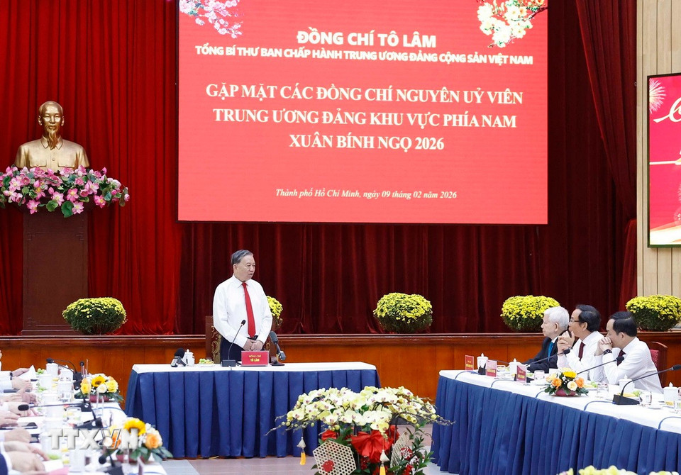 Tổng Bí thư Tô Lâm phát biểu tại buổi gặp mặt các đồng chí nguyên Ủy viên Trung ương Đảng khu vực phía Nam nhân dịp đón Xuân Bính Ngọ 2026. (Ảnh: Thống Nhất/TTXVN)