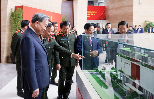 Tổng Bí thư Tô Lâm cùng các đại biểu tham quan mô hình Trụ sở Bộ Công an bên lề hội nghị.