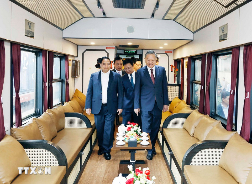Tổng Bí thư Tô Lâm, Thủ tướng Phạm Minh Chính và đoàn công tác Trung ương kiểm tra thực địa tại ga Đồng Đăng. (Ảnh: Thống Nhất/TTXVN)