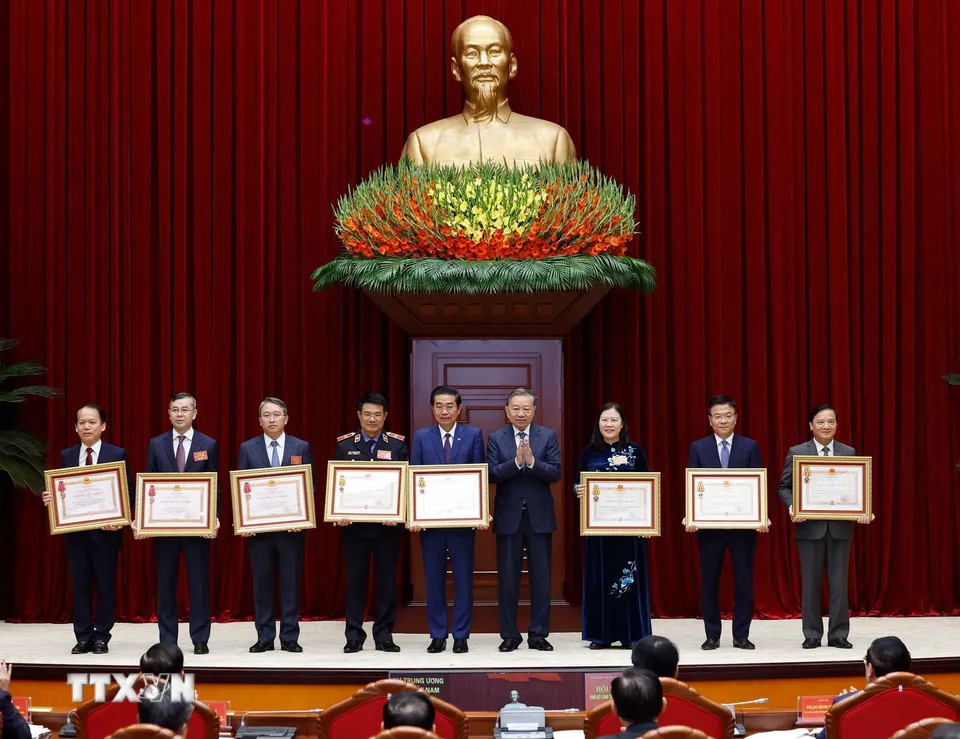 Tổng Bí thư Tô Lâm trao tặng Huân chương Độc lập Hạng Nhất, Nhì, Ba; Huân chương Quân công Hạng Nhì, Ba cho các đồng chí lãnh đạo. Ảnh: TTXVN