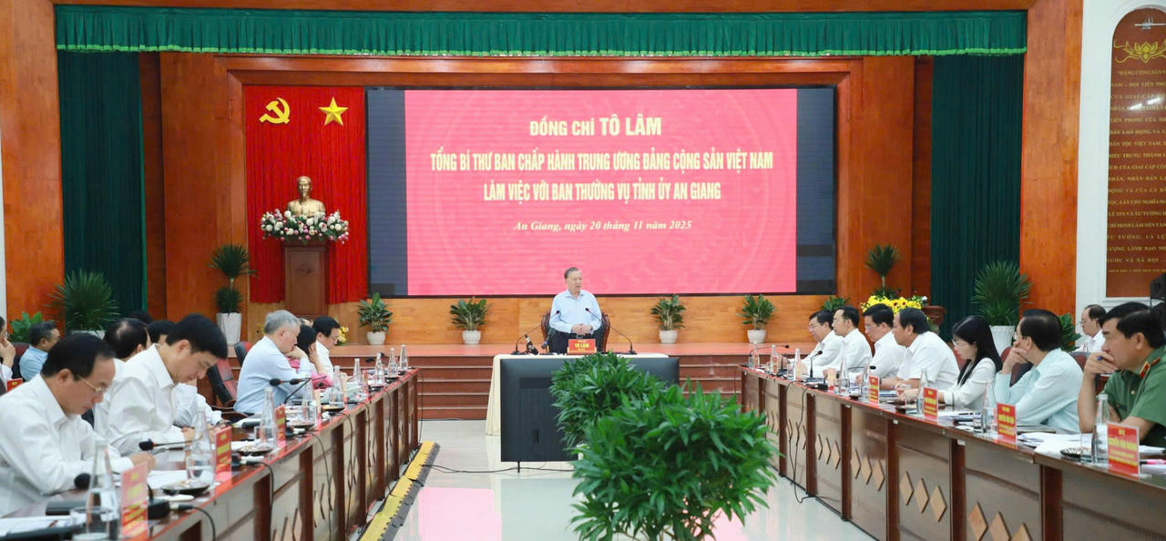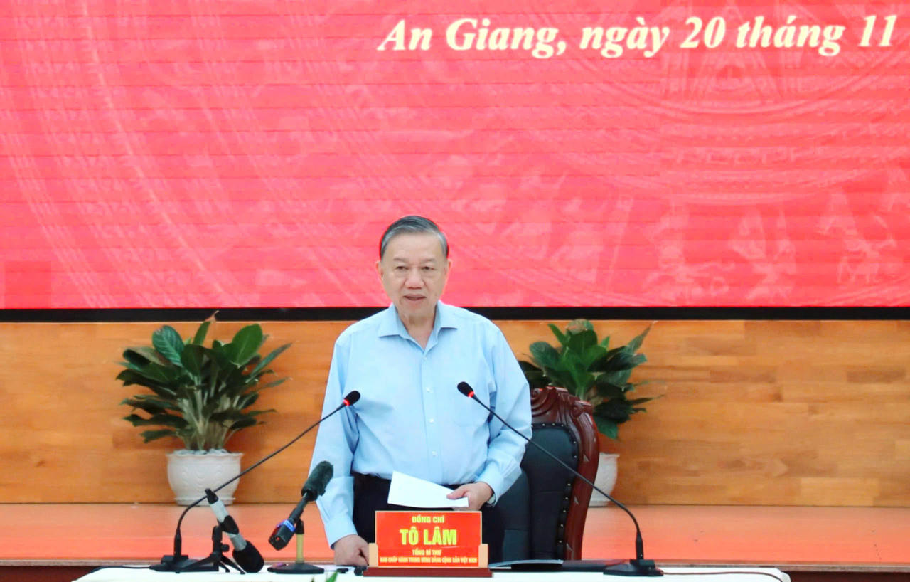 Phát biểu chỉ đạo tại buổi làm việc, Tổng Bí thư Tô Lâm ghi nhận và biểu dương sự nỗ lực, đoàn kết của Đảng bộ, chính quyền và nhân dân An Giang, tạo nền tảng quan trọng cho bứt phá trong giai đoạn mới.