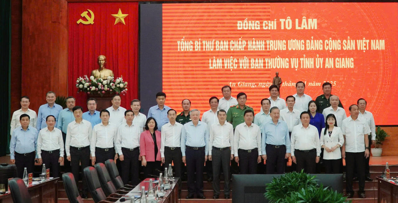 Tổng Bí thư Tô Lâm bày tỏ tin tưởng, với bản lĩnh, trí tuệ và việc phát huy đúng tầm những tiềm năng, lợi thế đặc thù, An Giang sẽ tạo ra những bứt phá mới, vươn lên tầm cao mới, khẳng định vị thế là một cực phát triển năng động của ĐBSCL.