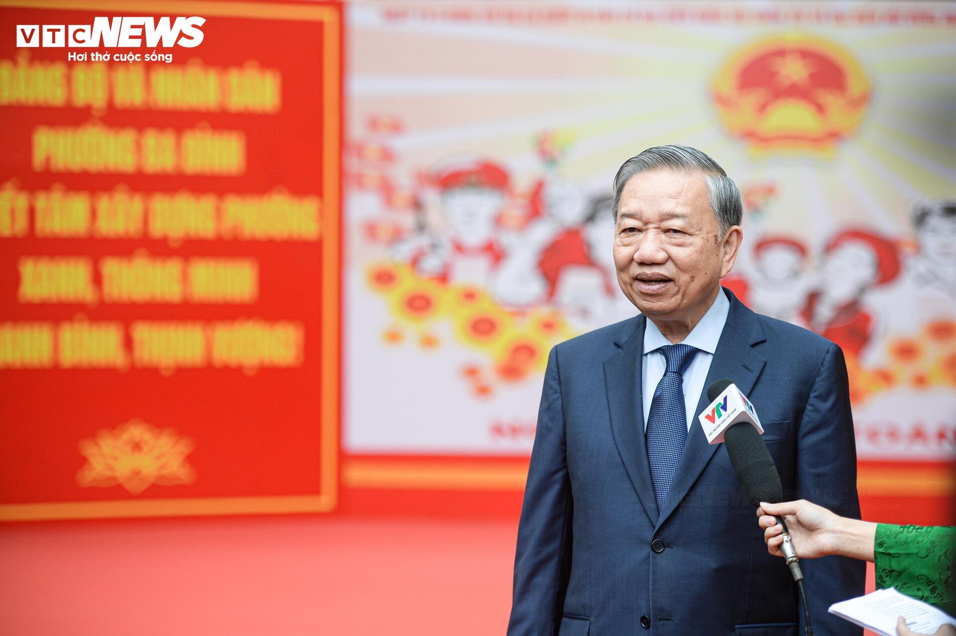 Phát biểu sau khi bỏ phiếu, Tổng Bí thư Tô Lâm bày tỏ sự phấn khởi khi chứng kiến đông đảo bà con Nhân dân, cử tri tham gia bầu cử đại biểu Quốc hội khóa XVI và đại biểu HĐND các cấp, nhiệm kỳ 2026-2031, với tinh thần phấn chấn.