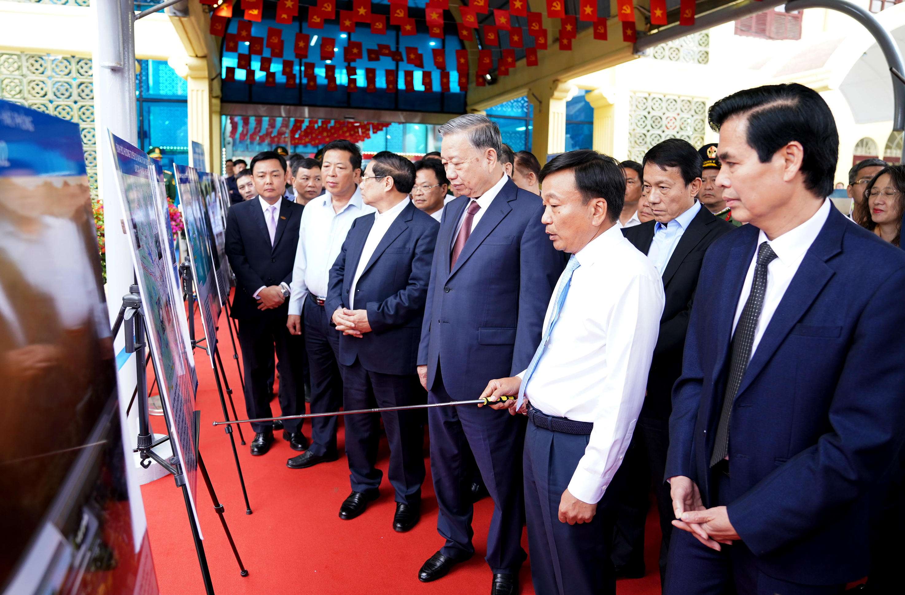 Đồng chí Tổng Bí thư Tô Lâm và Thủ tướng Chính phủ Phạm Minh Chính cùng lãnh đạo các bộ, ngành Trung ương và tỉnh Lạng Sơn kiểm tra bản đồ quy hoạch tuyến đường sắt Hà Nội - Đồng Đăng