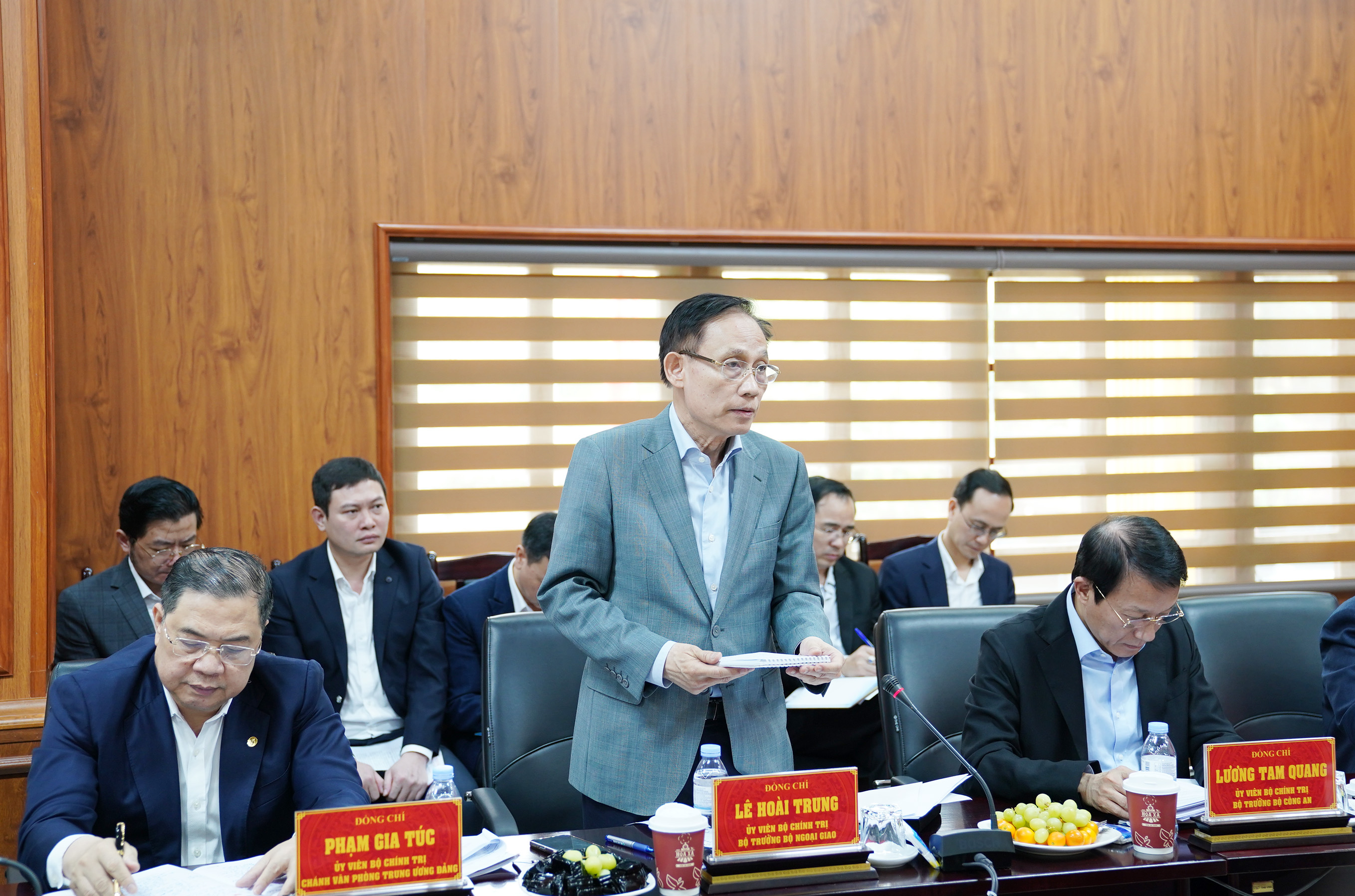 Đồng chí Lê Hoài Trung, Ủy viên Bộ Chính trị, Bộ trưởng Bộ Ngoại giao báo cáo một số nội dung liên quan tại buổi làm việc