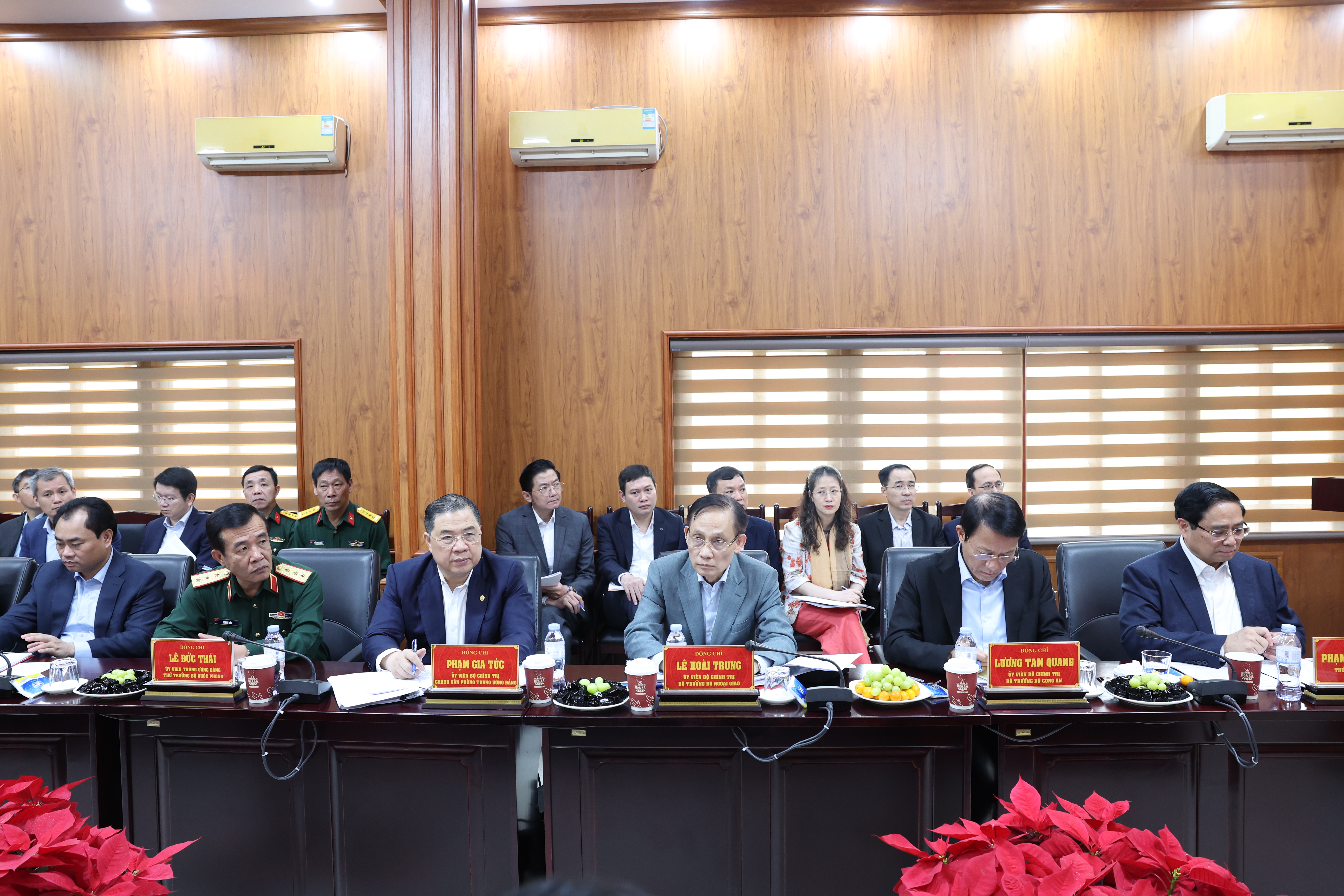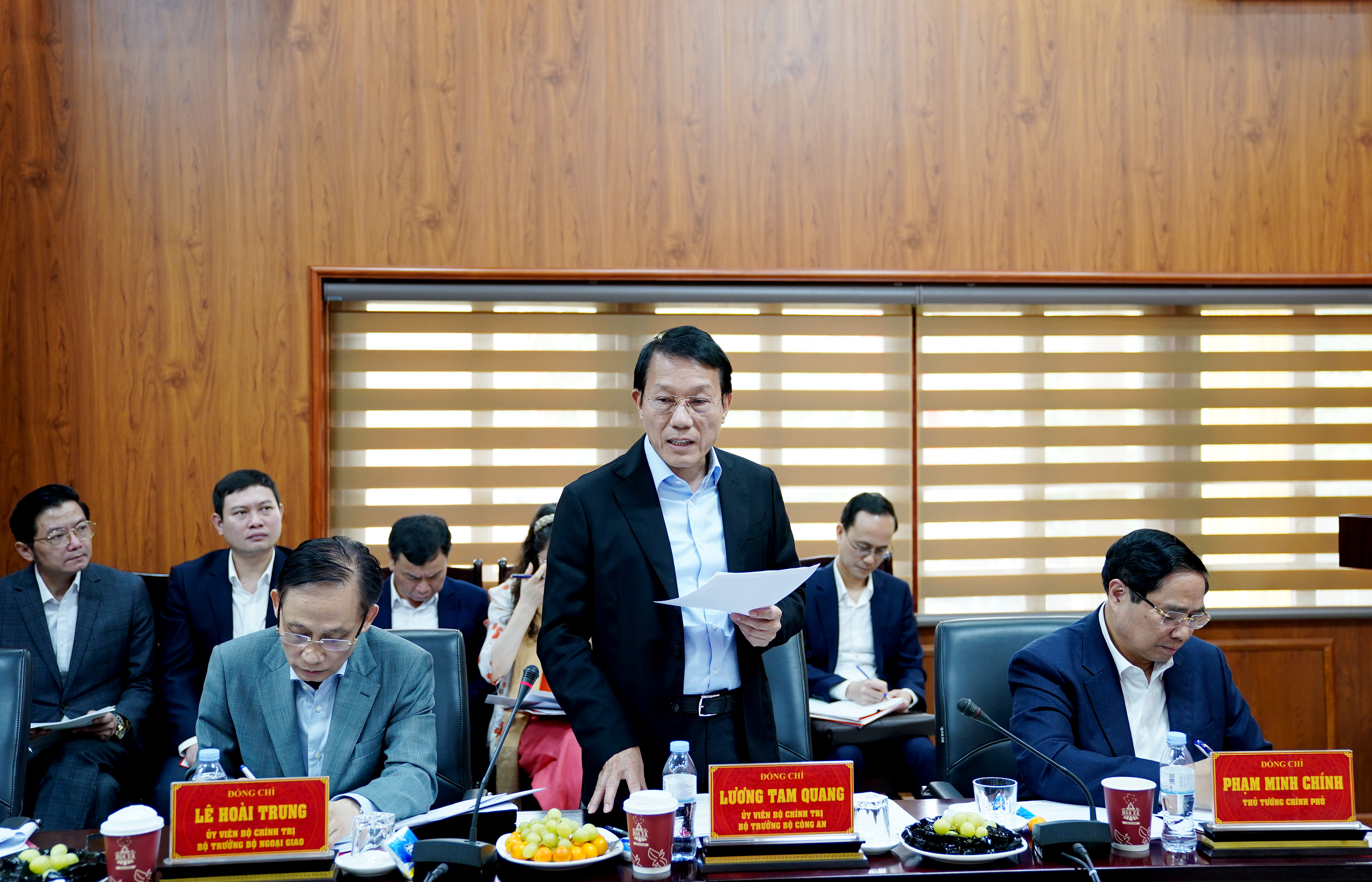 Dự buổi làm việc có các đồng chí: Thủ tướng Chính phủ Phạm Minh Chính; Đại tướng Lương Tam Quang, Ủy viên Bộ Chính trị, Bộ trưởng Bộ Công an; Lê Hoài Trung, Ủy viên Bộ Chính trị, Bộ trưởng Bộ Ngoại giao; Phạm Gia Túc, Ủy viên Bộ Chính trị, Chánh Văn phòng Trung ương Đảng; lãnh đạo một số bộ, ngành Trung ương, địa phương.