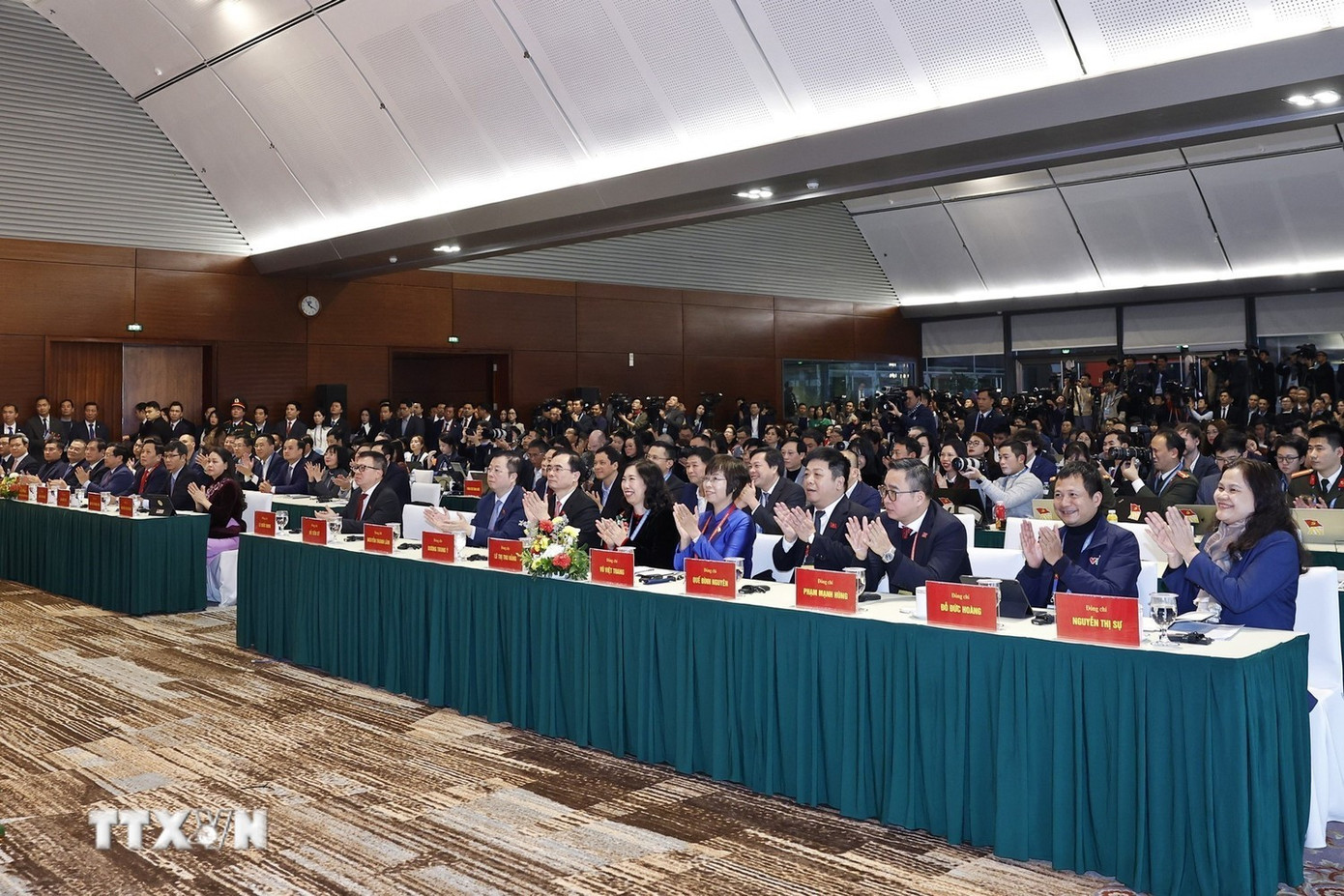 Cùng dự họp báo có các Ủy viên Bộ Chính trị khóa XIV: Thường trực Ban Bí thư Trần Cẩm Tú; Trưởng ban Tổ chức Trung ương Lê Minh Hưng; Trưởng ban Tuyên giáo và Dân vận Trung ương Trịnh Văn Quyết; Bộ trưởng Ngoại giao Lê Hoài Trung; Chánh Văn phòng Trung ương Đảng Phạm Gia Túc; Phó Giám đốc Thường trực Học viện Chính trị quốc gia Hồ Chí Minh Đoàn Minh Huấn; và Ủy viên Trung ương Đảng, Thứ trưởng Thường trực Bộ Văn hóa Thể thao và Du lịch Lâm Thị Phương Thanh.