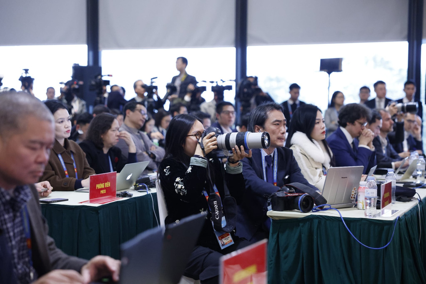 Các nhà báo trong nước và quốc tế tham dự buổi họp báo. (Ảnh: TTXVN)