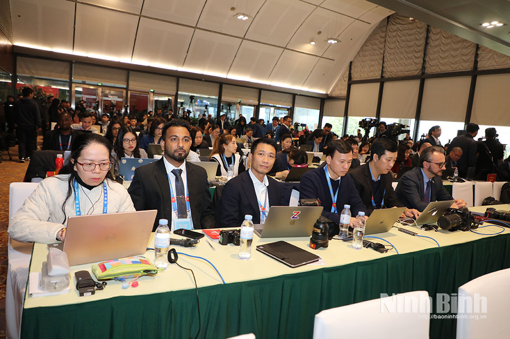 Các phóng viên trong nước và quốc tế tác nghiệp tại họp báo.