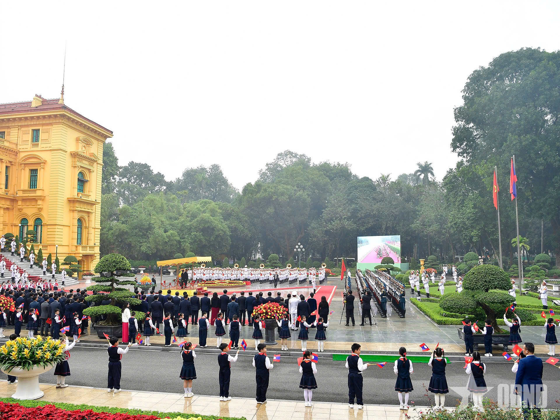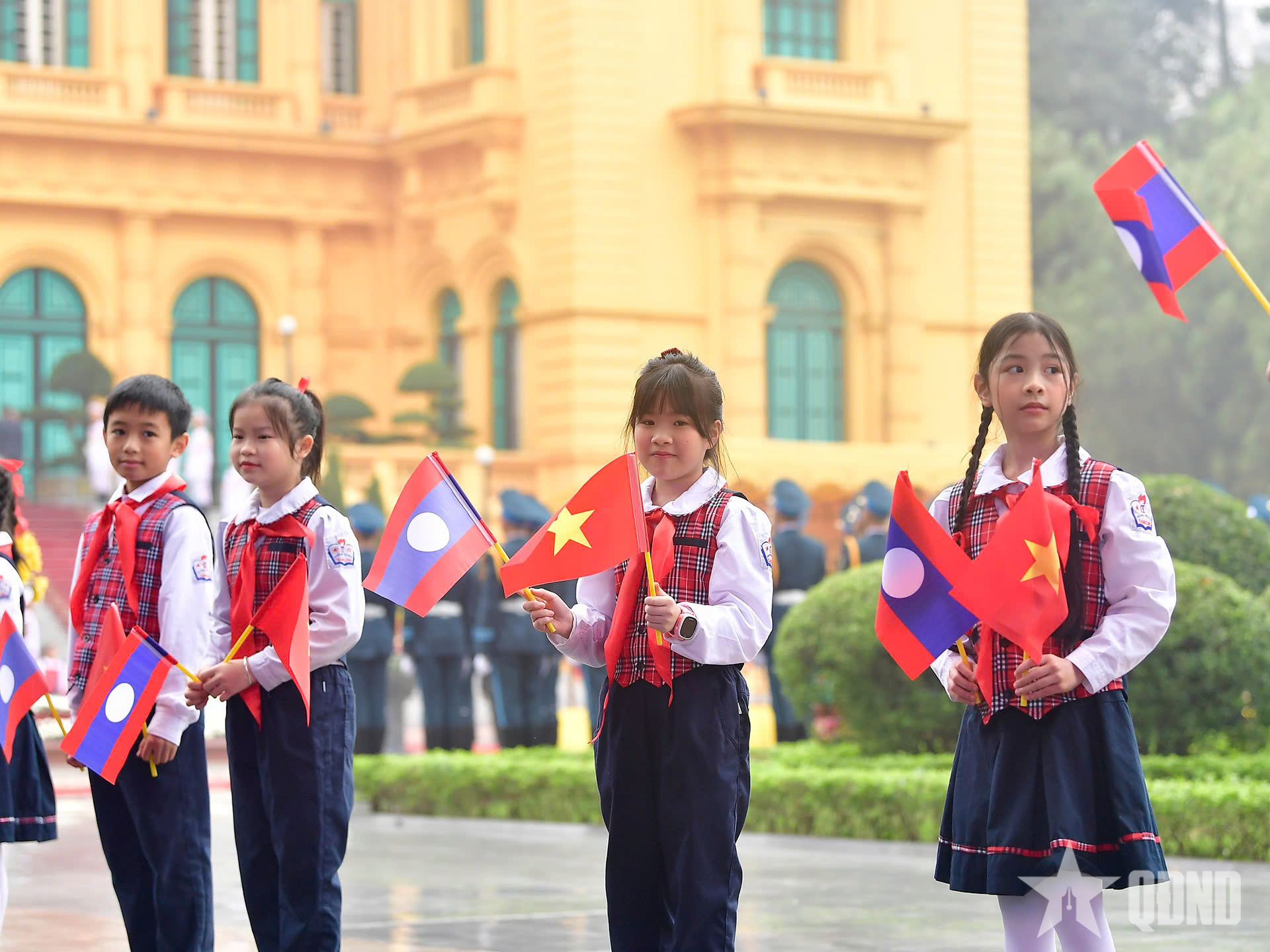 Tổng Bí thư Tô Lâm trân trọng mời Tổng Bí thư, Chủ tịch nước Lào Thongloun Sisoulith bước lên bục danh dự. Những loạt đại bác vang lên hùng tráng. Quân nhạc cử quốc thiều hai nước. Tổng Bí thư Tô Lâm mời Tổng Bí thư, Chủ tịch nước Lào Thongloun Sisoulith duyệt Đội danh dự Quân đội nhân dân Việt Nam. Sau duyệt đội danh dự, Tổng Bí thư Tô Lâm và Tổng Bí thư, Chủ tịch nước Lào Thongloun Sisoulith giới thiệu các thành viên đoàn đại biểu cấp cao hai nước tại lễ đón.