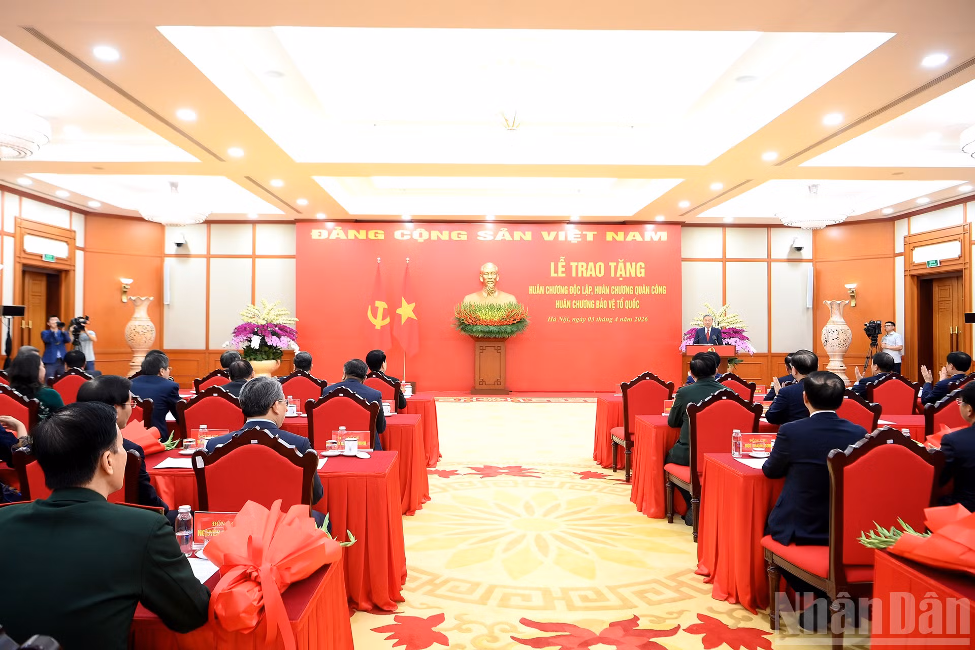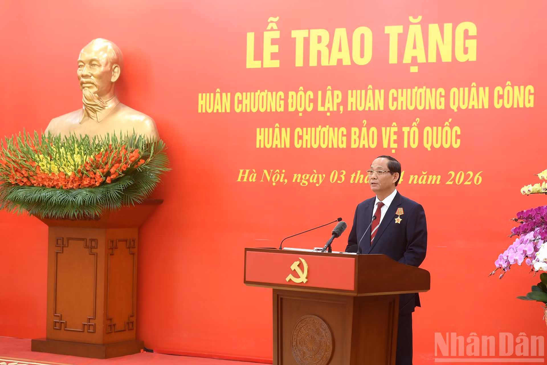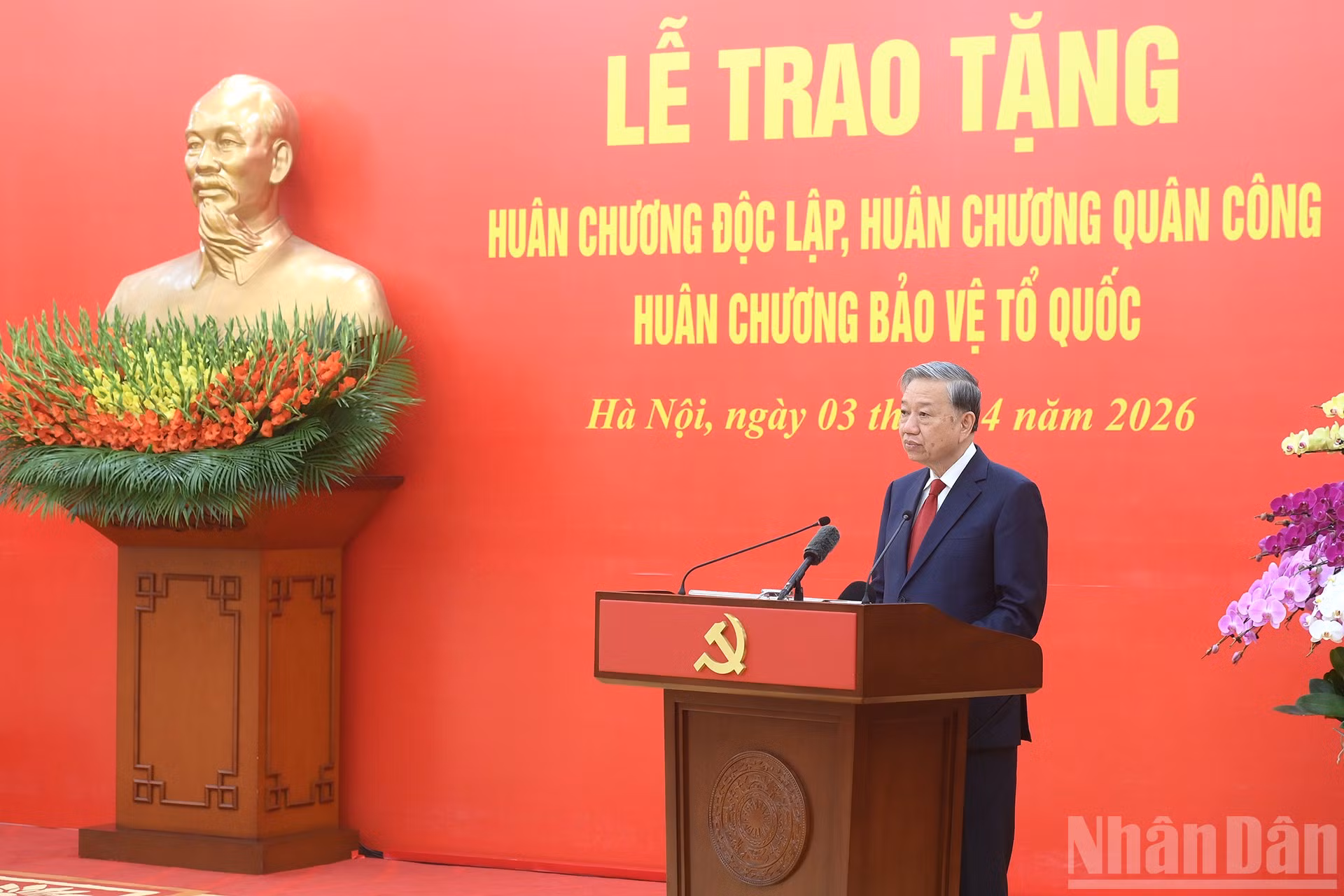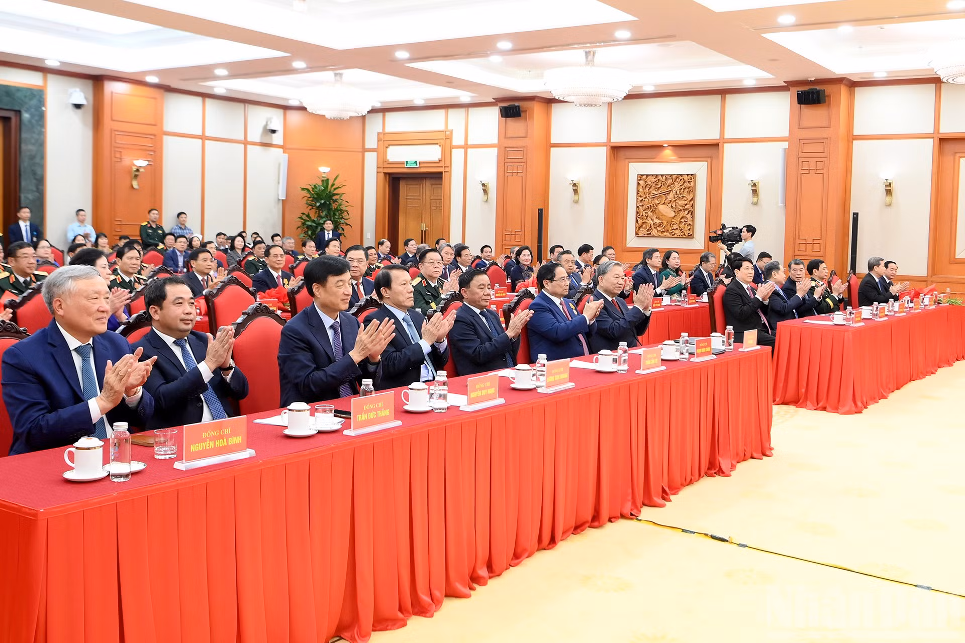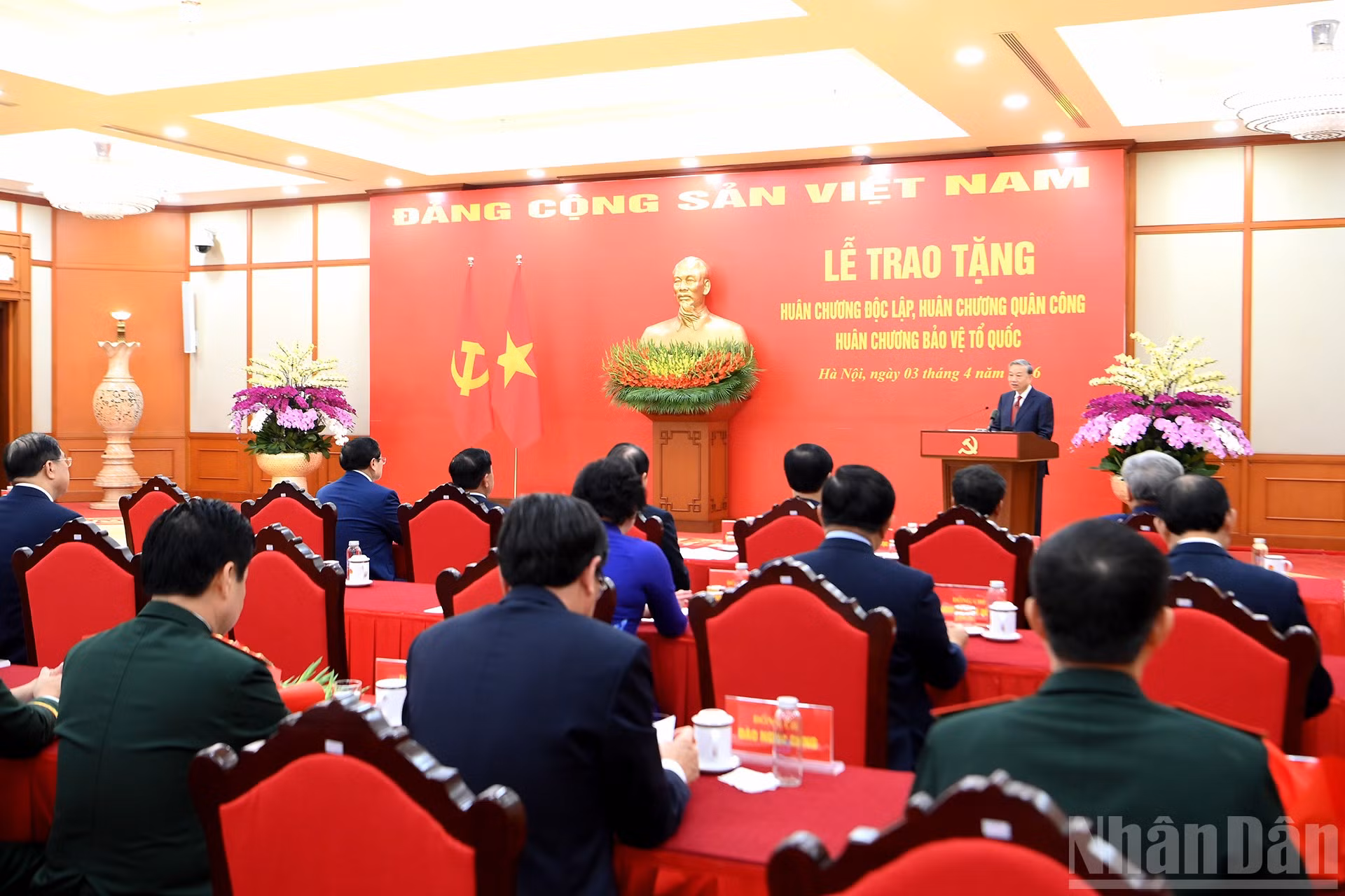 Tổng Bí thư Tô Lâm trao Huân chương Độc lập hạng Nhất tặng đồng chí Phạm Minh Chính, Ủy viên Bộ Chính trị khóa XIII, Thủ tướng Chính phủ và Huân chương Quân công hạng Nhất tặng các đồng chí: Đại tướng Lương Cường, Ủy viên Bộ Chính trị khóa XIII, Chủ tịch nước; Đại tướng Phan Văn Giang, Ủy viên Bộ Chính trị, Phó Bí thư Quân ủy Trung ương, Bộ trưởng Quốc phòng; Nguyễn Xuân Thắng, Ủy viên Bộ Chính trị khóa XIII, nguyên Giám đốc Học viện Chính trị quốc gia Hồ Chí Minh, Chủ tịch Hội đồng Lý luận Trung ương; Thượng tướng Trần Quang Phương, Ủy viên Trung ương Đảng khóa XIII, Phó Chủ tịch Quốc hội; Nguyễn Chí Dũng, Ủy viên Trung ương Đảng khóa XIII, Phó Thủ tướng Chính phủ.