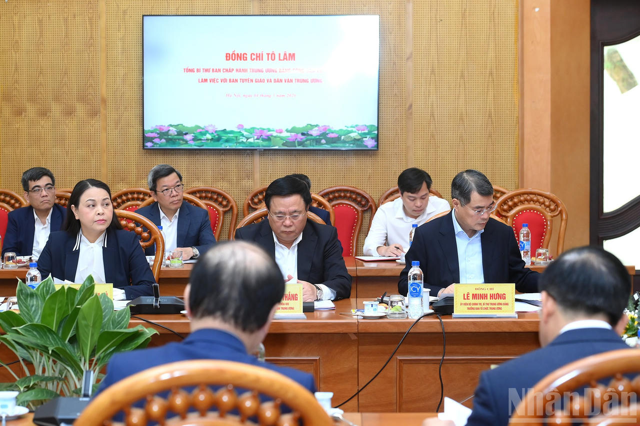 Phát biểu tại buổi làm việc, Tổng Bí thư Tô Lâm đánh giá cao sự chuẩn bị của Ban Tuyên giáo và Dân vận Trung ương; các ý kiến phát biểu tâm huyết, sát với đòi hỏi thực tiễn, cần được tiếp thu, tiếp tục nghiên cứu hoàn thiện dự thảo quy định. Tổng Bí thư đề nghị thống nhất quan điểm: Nếu kinh tế tạo ra nội lực vật chất để đất nước đi nhanh thì chính trị, tư tưởng và văn hóa tạo ra nội lực tinh thần để dân tộc đi xa, đi vững hơn trong giai đoạn phát triển mới.