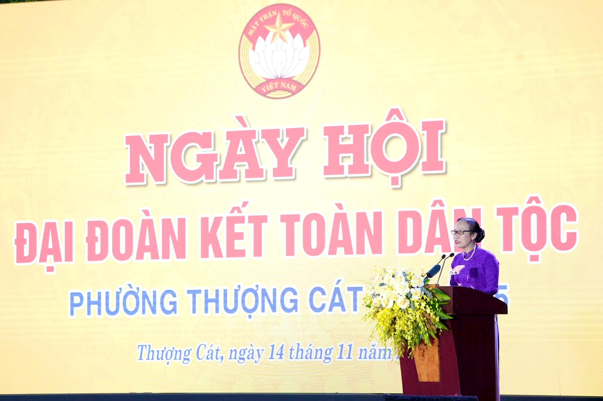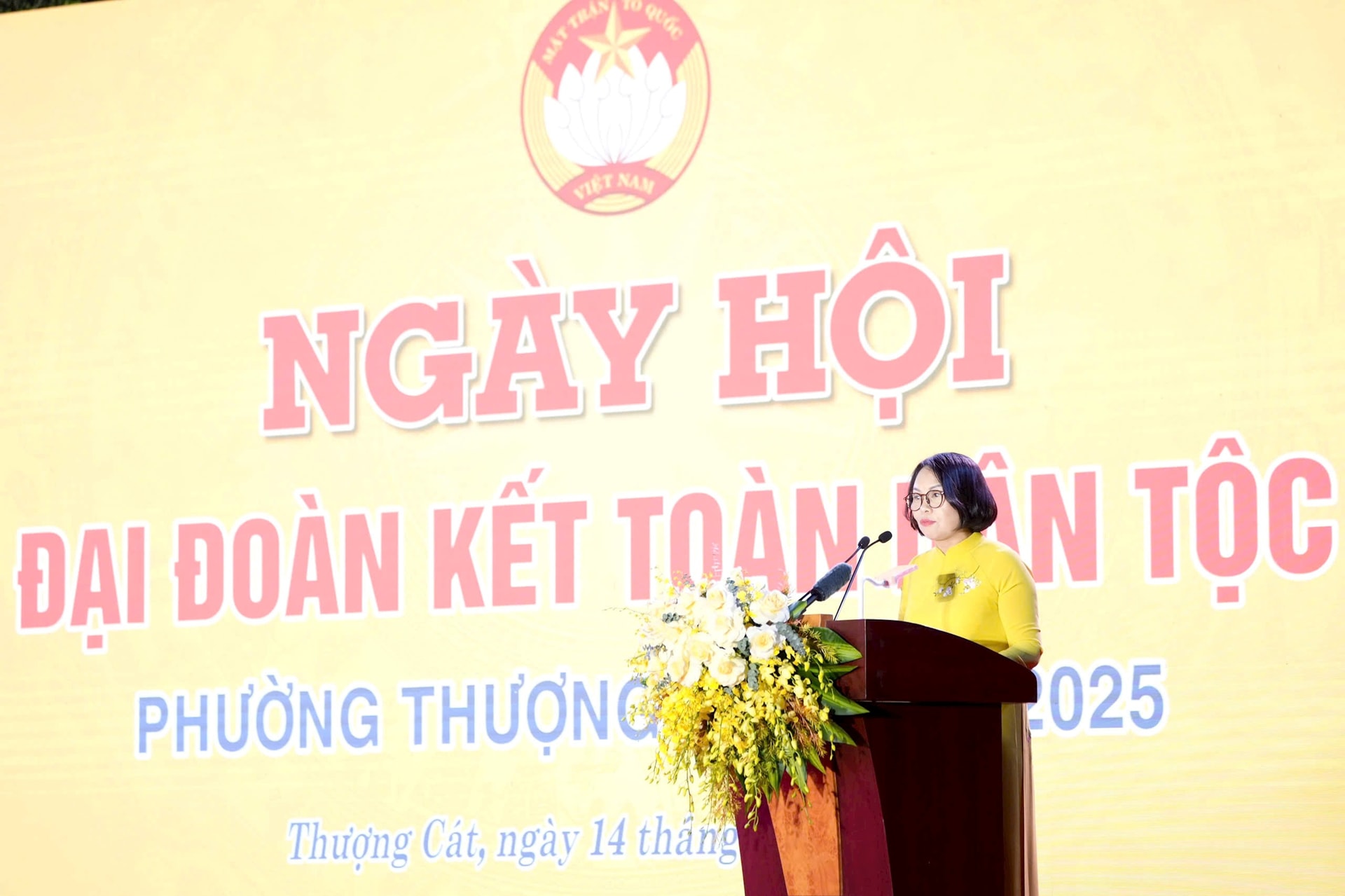 Báo cáo tại ngày hội, Chủ tịch Ủy ban MTTQ Việt Nam phường Thượng Cát Văn Thúy Hoa cho biết, là một trong 126 xã, phường mới của thành phố được thành lập và chính thức vận hành theo mô hình chính quyền địa phương 2 cấp từ ngày 1-7-2025, phường Thượng Cát mang đậm bản sắc văn hóa truyền thống vùng ven sông Hồng, vẫn gìn giữ được không gian làng cổ, tín ngưỡng dân gian và các hoạt động lễ hội lâu đời.