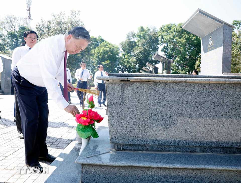 Tổng Bí thư Tô Lâm và đoàn công tác Trung ương dâng hoa, dâng hương tại Nghĩa trang Liệt sỹ Trà Võ. (Ảnh: Thống Nhất/TTXVN)