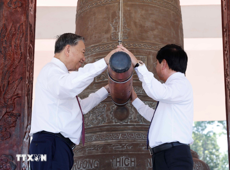 Tổng Bí thư Tô Lâm thỉnh chuông, tưởng niệm các liệt sỹ tại Nghĩa trang Liệt sỹ Trà Võ. (Ảnh: Thống Nhất/TTXVN)