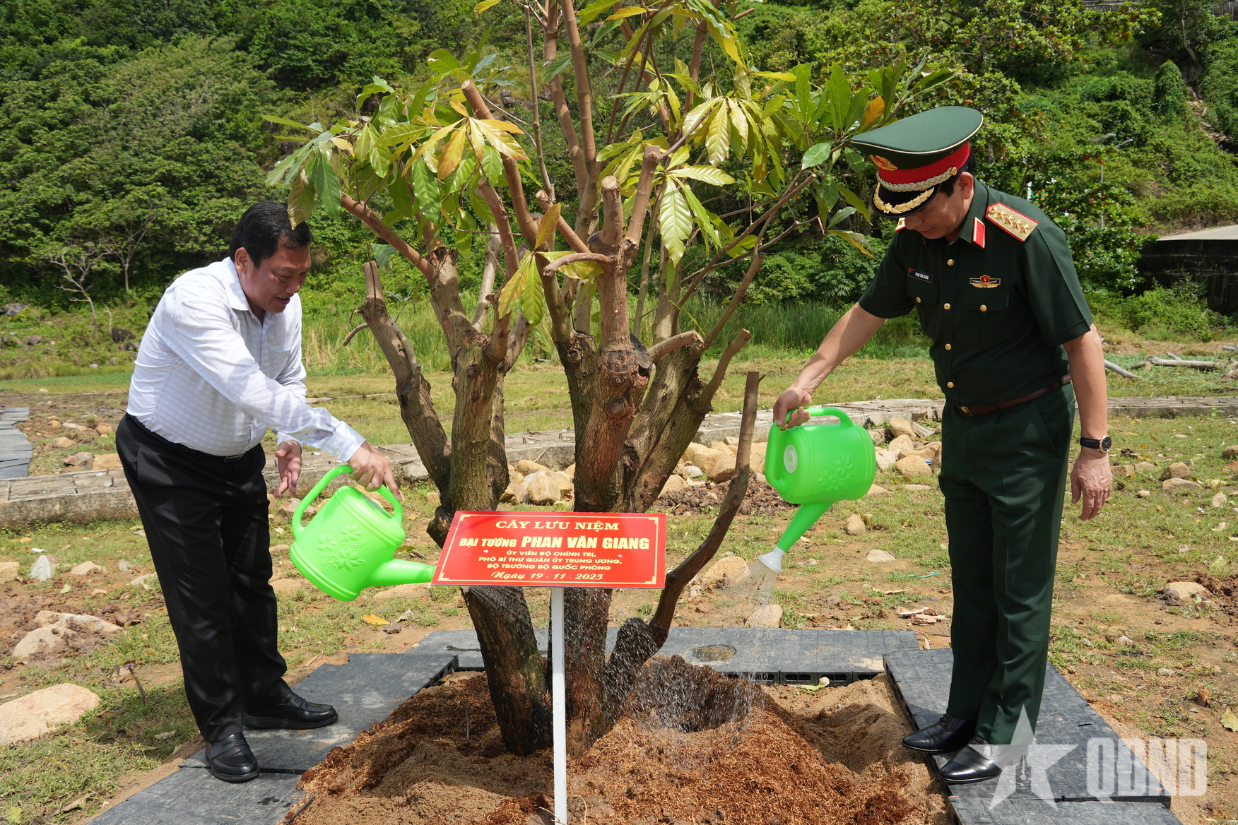 Đại tướng Phan Văn Giang, Ủy viên Bộ Chính trị, Phó bí thư Quân ủy Trung ương, Bộ trưởng Bộ Quốc phòng trồng cây lưu niệm phía sau khu tưởng niệm.