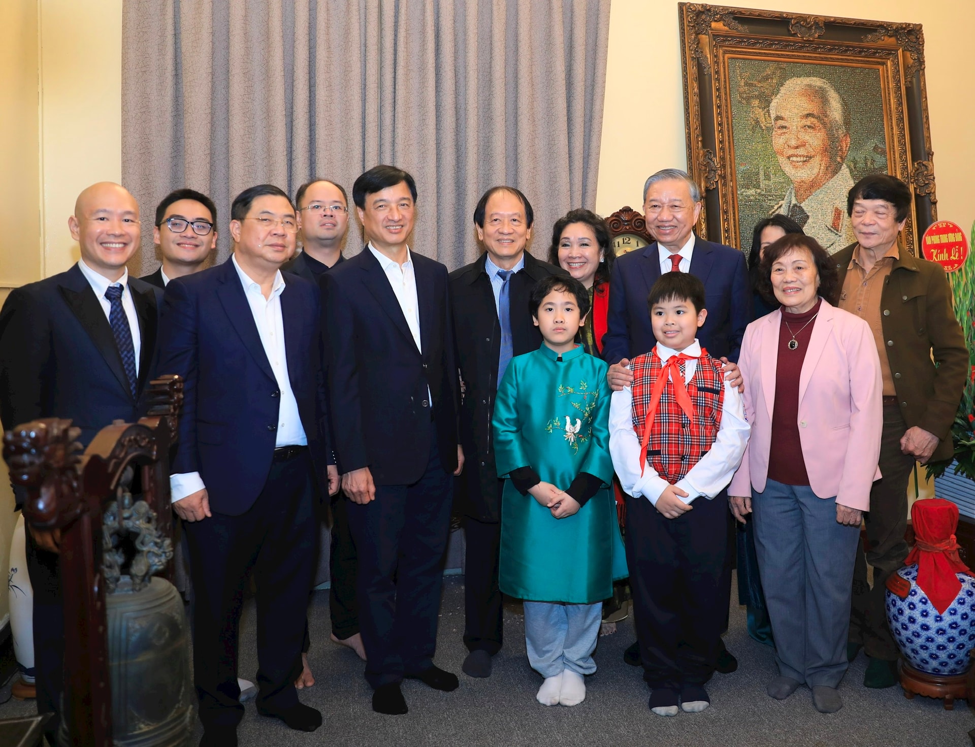 Tổng Bí thư Tô Lâm, Chánh Văn phòng Trung ương Đảng Phạm Gia Túc và Bí thư Thành ủy Nguyễn Duy Ngọc với thân nhân gia đình Đại tướng Võ Nguyên Giáp. Ảnh: Quang Thái