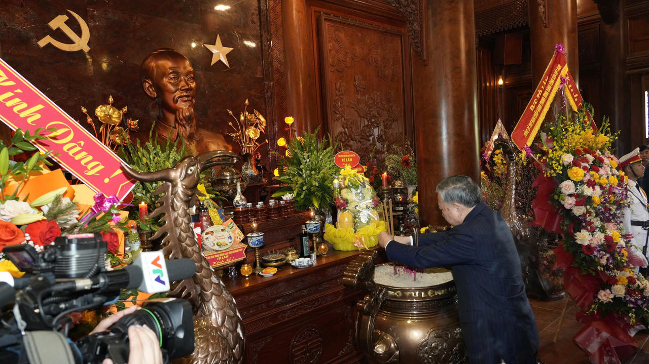 Tại Khu di tích quốc gia đặc biệt Kim Liên, Tổng Bí thư Tô Lâm cùng các đại biểu đã thành kính dâng hoa, dâng hương, bày tỏ lòng biết ơn vô hạn đối với Chủ tịch Hồ Chí Minh, vị lãnh tụ thiên tài của Đảng và nhân dân ta, Người thầy vĩ đại của cách mạng Việt Nam, Anh hùng giải phóng dân tộc, danh nhân văn hóa kiệt xuất. Người đã sáng lập và rèn luyện Đảng Cộng sản Việt Nam; hy sinh trọn đời cho sự nghiệp giải phóng dân tộc, đấu tranh cho hòa bình, hạnh phúc của nhân dân Việt Nam và nhân dân thế giới.