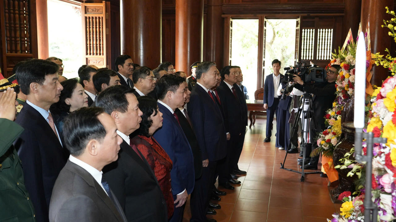 Trước đó, Tổng Bí thư Tô Lâm cùng đoàn đại biểu đã thành kính dâng lễ, dâng hoa, dâng hương tại đền Chung Sơn - đền thờ gia tiên Chủ tịch Hồ Chí Minh.