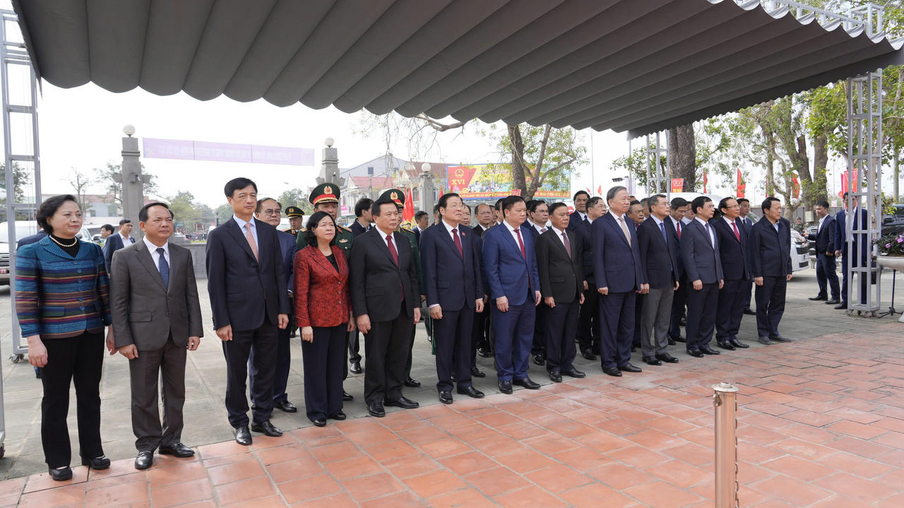 Tham gia đoàn cùng Tổng Bí thư Tô Lâm, có các đồng chí Ủy viên Bộ Chính trị: Trần Cẩm Tú, Thường trực Ban Bí thư; Lê Minh Hưng, Trưởng ban Tổ chức Trung ương; Bùi Thị Minh Hoài, Chủ tịch Ủy ban Trung ương Mặt trận tổ quốc Việt Nam; Trần Sỹ Thanh, Chủ nhiệm Ủy ban Kiểm tra Trung ương; Trịnh Văn Quyết, Trưởng Ban Tuyên giáo và Dân vận Trung ương; Đại tướng Phan Văn Giang, Bộ trưởng Quốc phòng; Đại tướng Lương Tam Quang, Bộ trưởng Công an; Nguyễn Duy Ngọc, Bí thư Thành ủy Hà Nội; Phạm Gia Túc, Chánh Văn phòng Trung ương Đảng; Đoàn Minh Huấn, Phó Giám đốc Thường trực Học viện Chính trị quốc gia Hồ Chí Minh; các đồng chí Bí thư Trung ương Đảng, Ủy viên Trung ương Đảng, lãnh đạo Chính phủ, các ban, bộ, ngành Trung ương, địa phương, Quân khu 4.