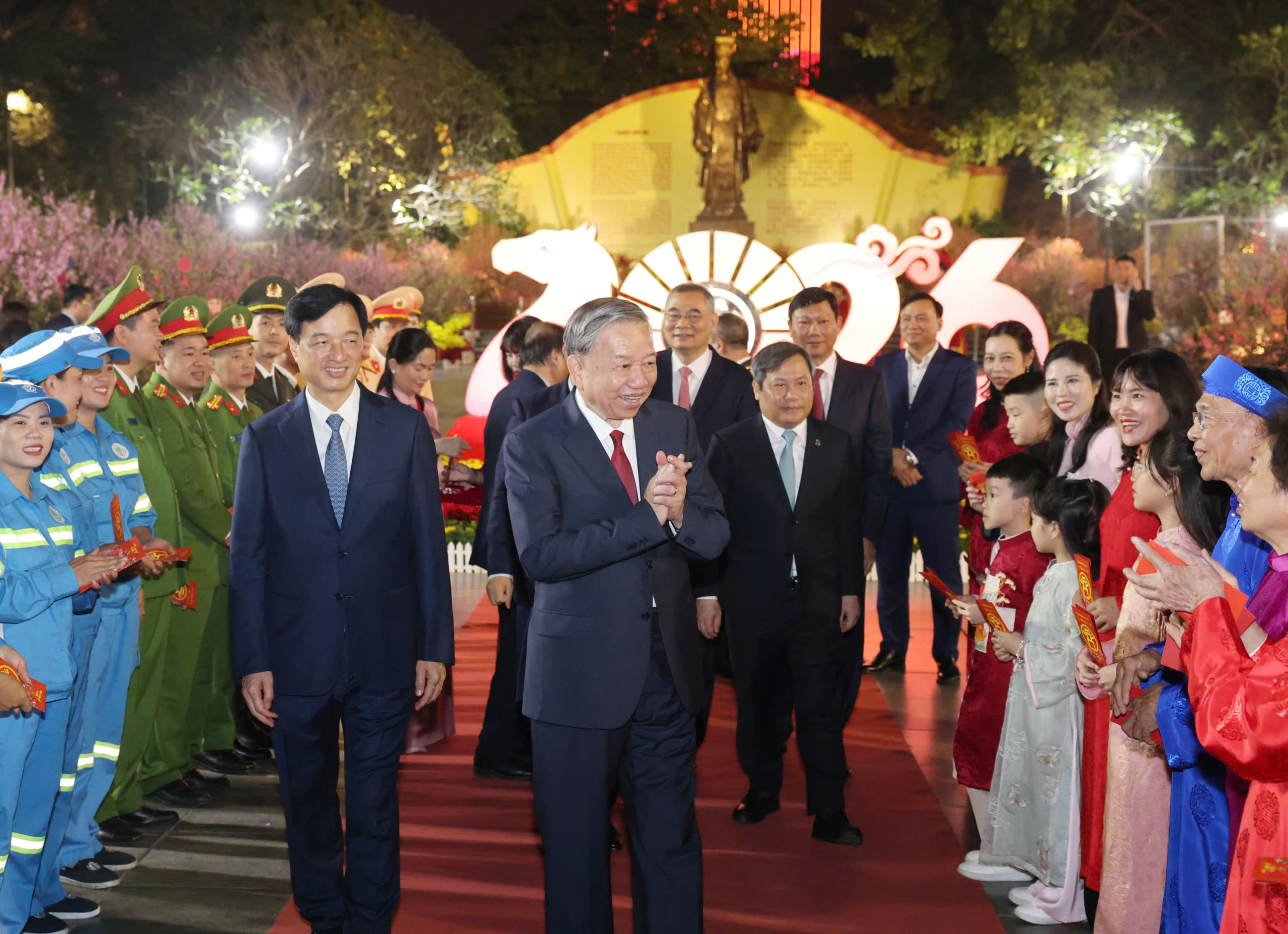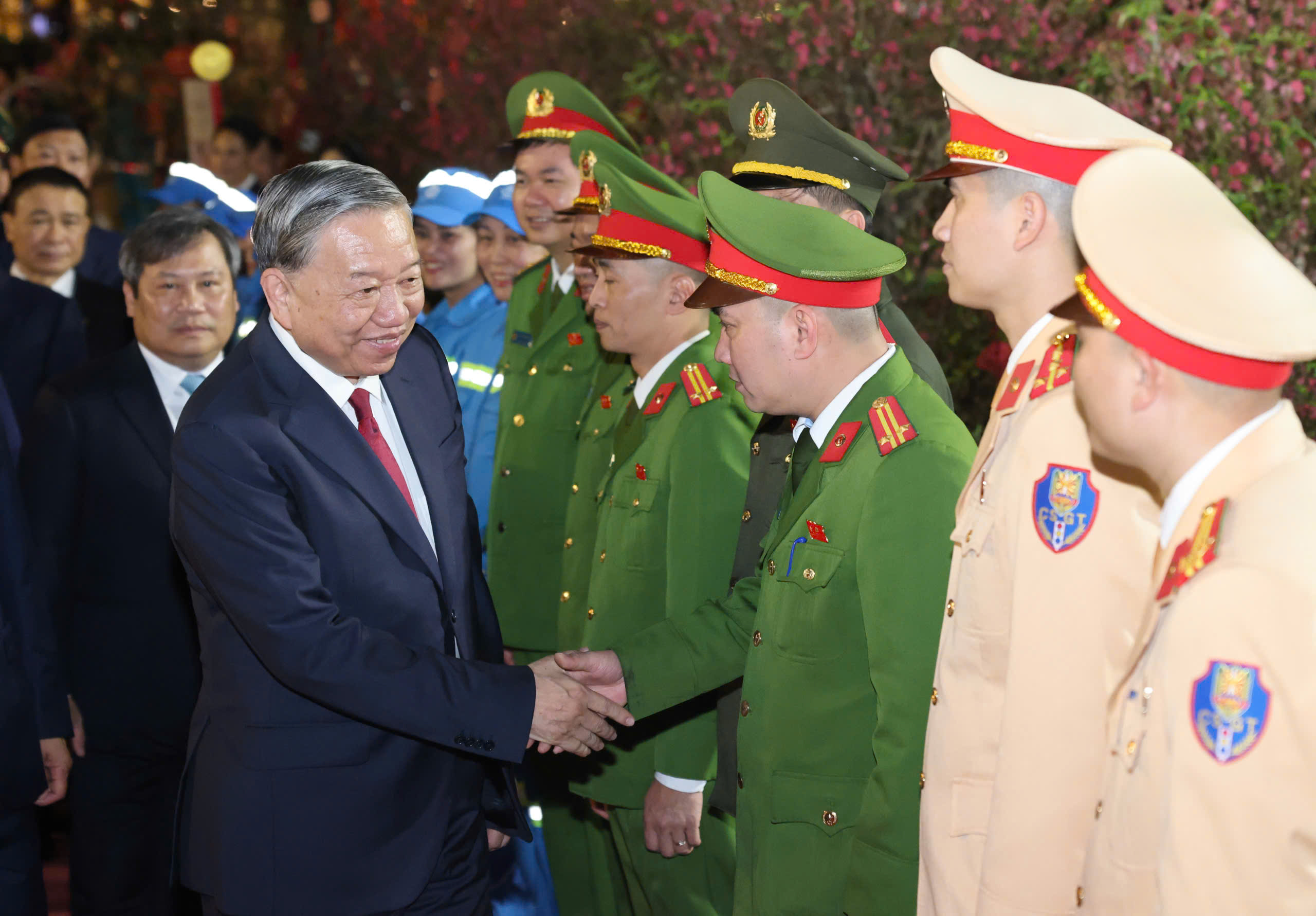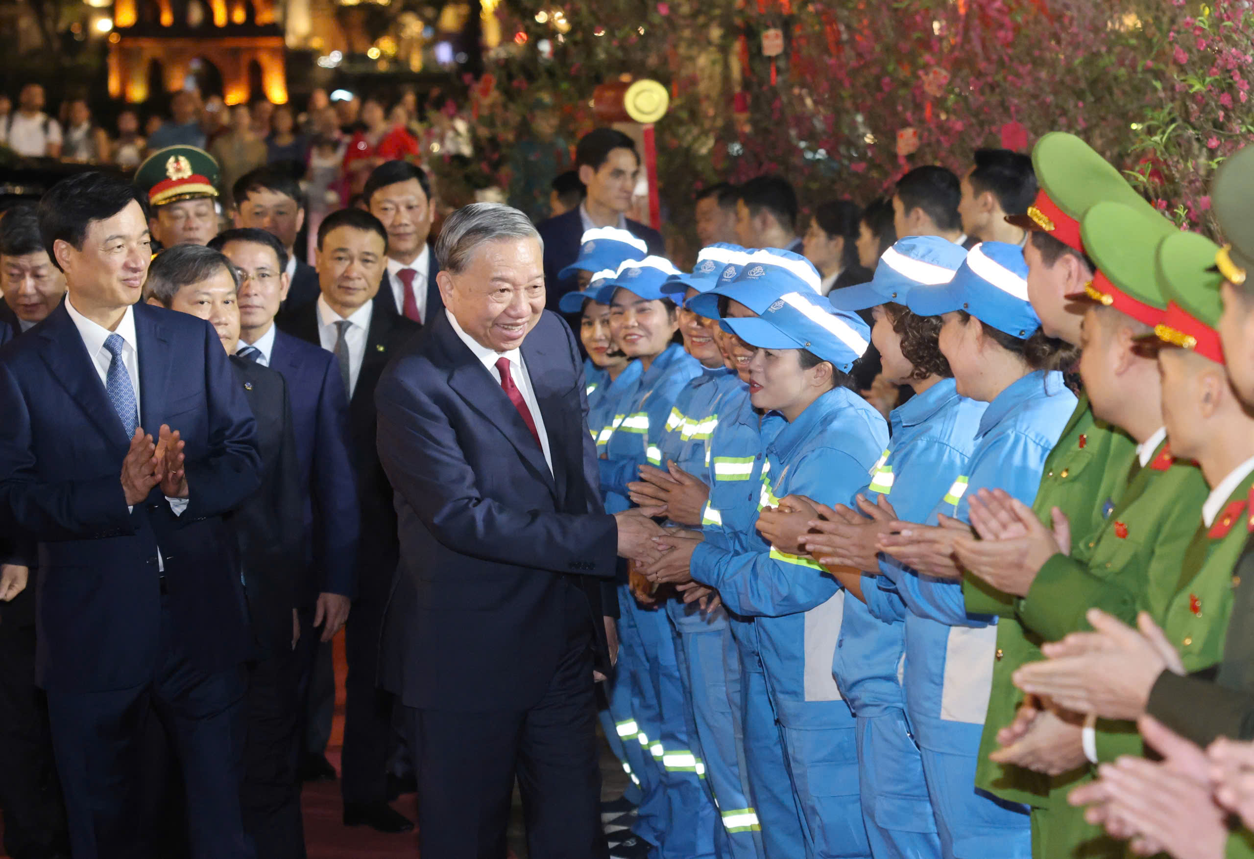 Tiếp đó, Tổng Bí thư Tô Lâm cùng các đồng chí lãnh đạo Trung ương và TP Hà Nội đã chúc tết công nhân, người lao động, các chiến sĩ công an, cảnh sát giao thông làm nhiệm vụ và đông đảo nhân dân Thủ đô.