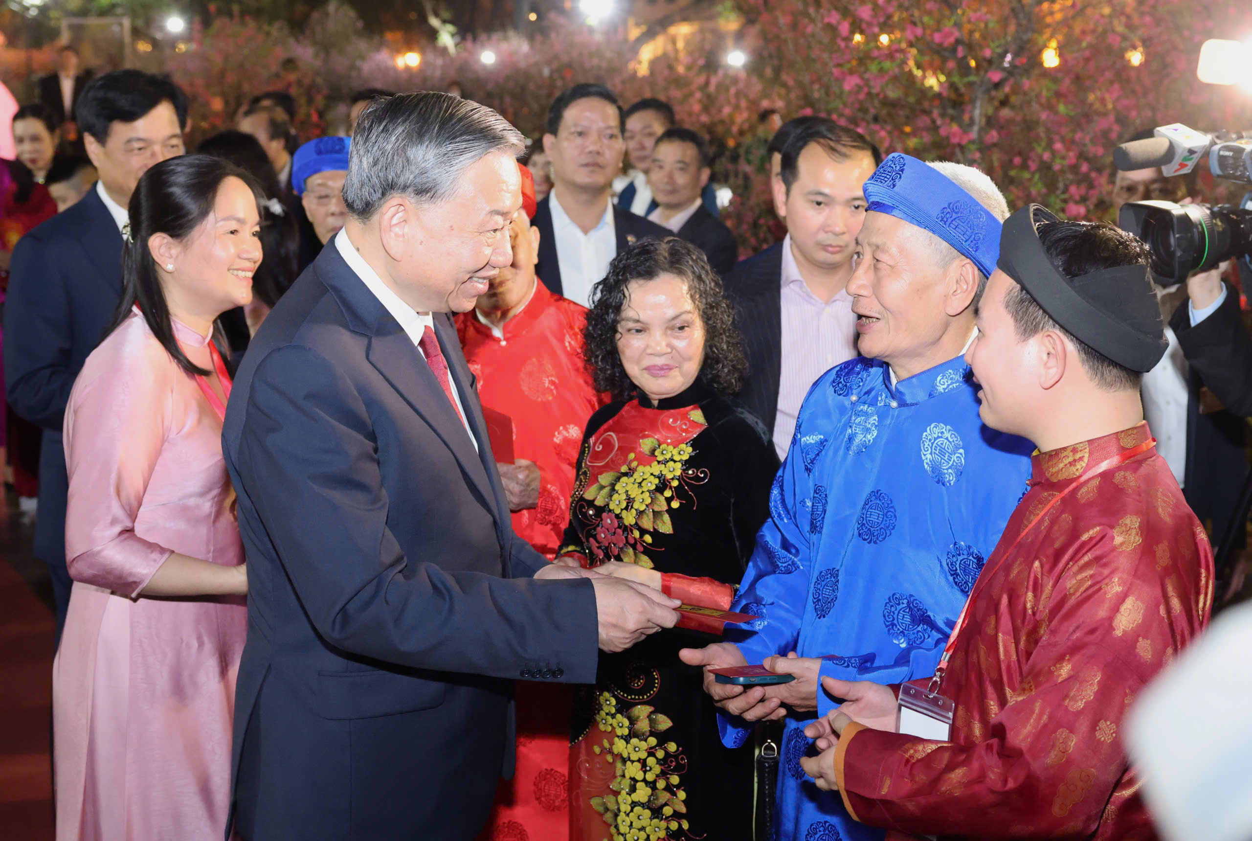 Tổng Bí thư Tô Lâm thăm hỏi, chúc tết và lì xì người cao tuổi. Ảnh: QUANG PHÚC