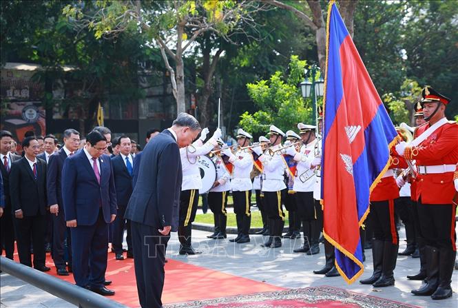 Tổng Bí thư Tô Lâm đặt vòng hoa tại Đài Hữu nghị Campuchia - Việt Nam. Ảnh: Dương Giang/TTXVN
