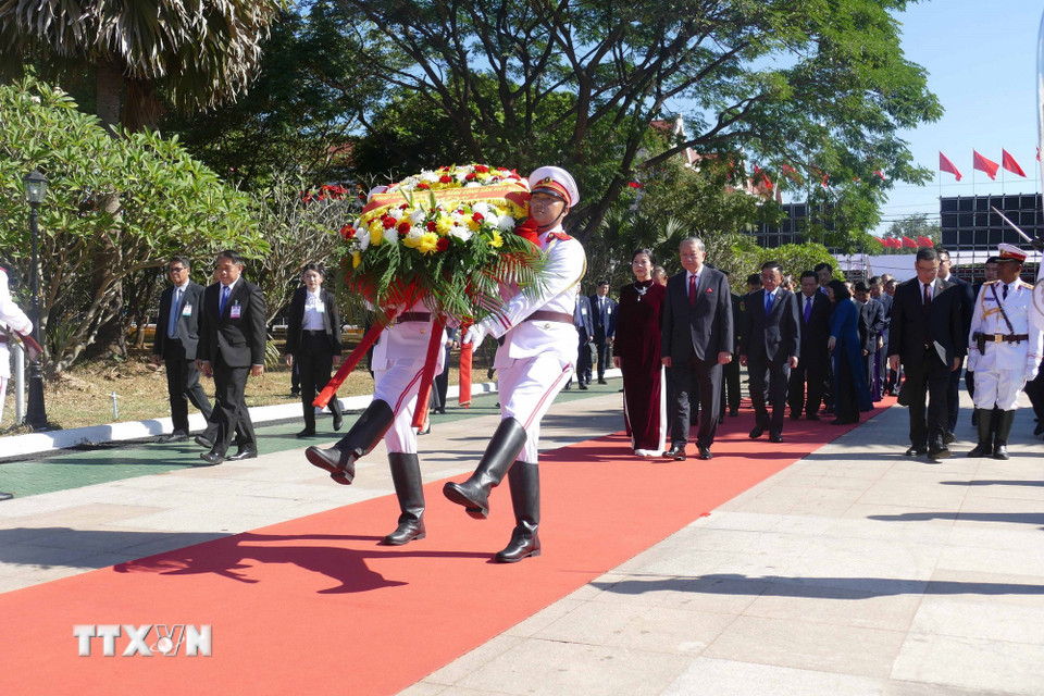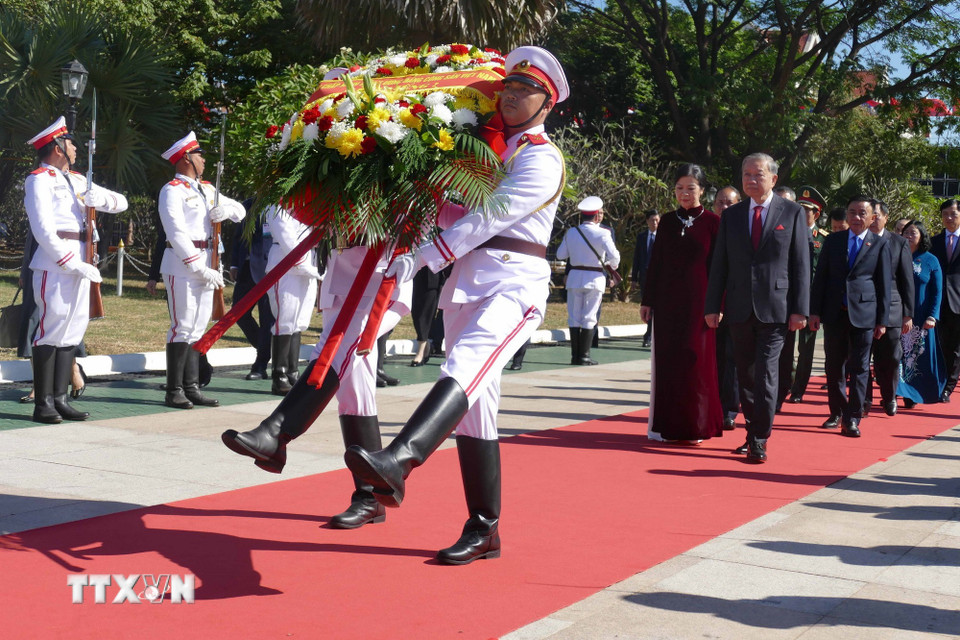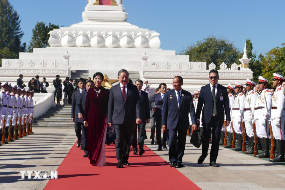 Tổng Bí thư Tô Lâm và Phu nhân cùng Đoàn đại biểu cấp cao Việt Nam đặt vòng hoa tại Đài tưởng niệm các chiến sỹ vô danh ở thủ đô Vientiane. (Ảnh: Xuân Tú/TTXVN)