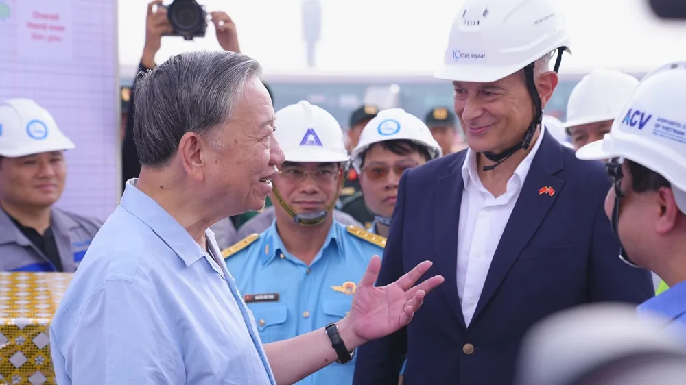 Tổng Bí thư Tô Lâm cùng đoàn công tác Trung ương đến thăm, nắm tình hình xây dựng Sân bay Long Thành. Ảnh: Vinaconex