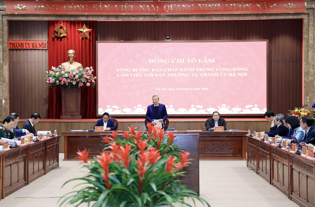 Sau khi nghe phát biểu ý kiến của các lãnh đạo Chính phủ, Quốc hội, ban, bộ, ngành trung ương; lãnh đạo thành phố Hà Nội, phát biểu kết luận và chỉ đạo tại cuộc làm việc, Tổng Bí thư Tô Lâm nhấn mạnh, đây không phải là một cuộc làm việc thông thường mà là dịp nhìn nhận một cách căn cơ, toàn diện vai trò, vị trí và trách nhiệm của Thủ đô Hà Nội trong tiến trình phát triển chung của đất nước.
