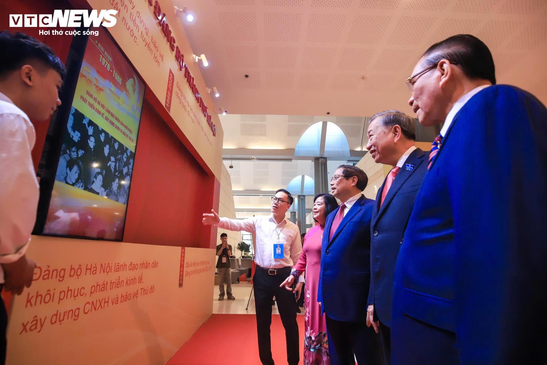 Tổng Bí thư Tô Lâm, nguyên Tổng Bí thư Nông Đức Mạnh, Thủ tướng Phạm Minh Chính, Bí thư Thành ủy Hà Nội Bùi Thị Minh Hoài tham quan không gian triển lãm bên lề Đại hội.