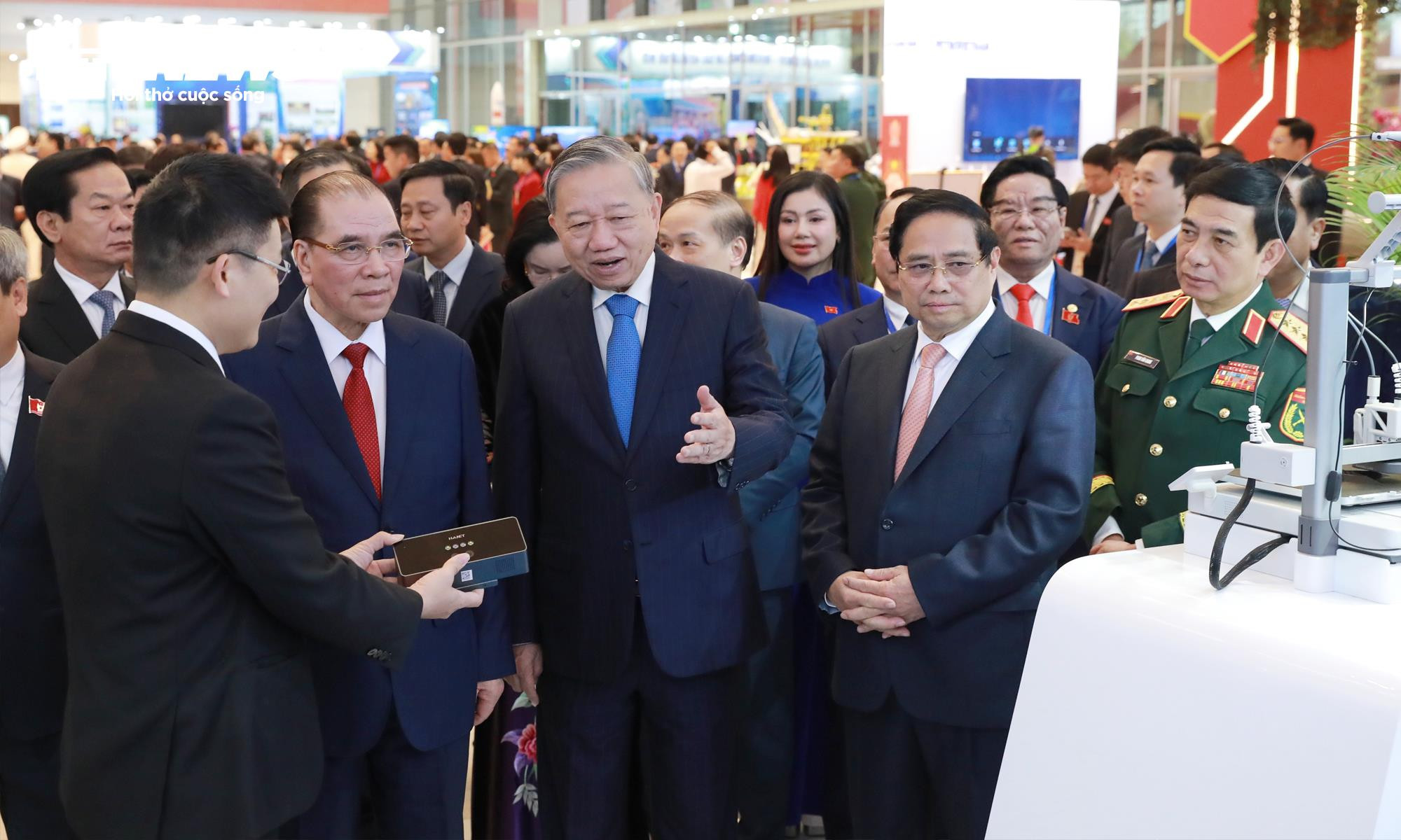 Tổng Bí thư Tô Lâm, nguyên Tổng Bí thư Nông Đức Mạnh, Thủ tướng Phạm Minh Chính thăm quan khu trưng bày các sản phẩm khoa học công nghệ.