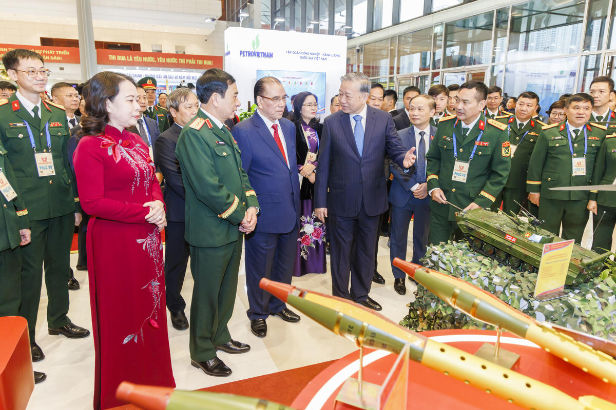 Tổng Bí thư Tô Lâm và các đại biểu tham quan gian trưng bày sản phẩm của Bộ Quốc phòng bên lề Đại hội. Ảnh: Quang Vinh.