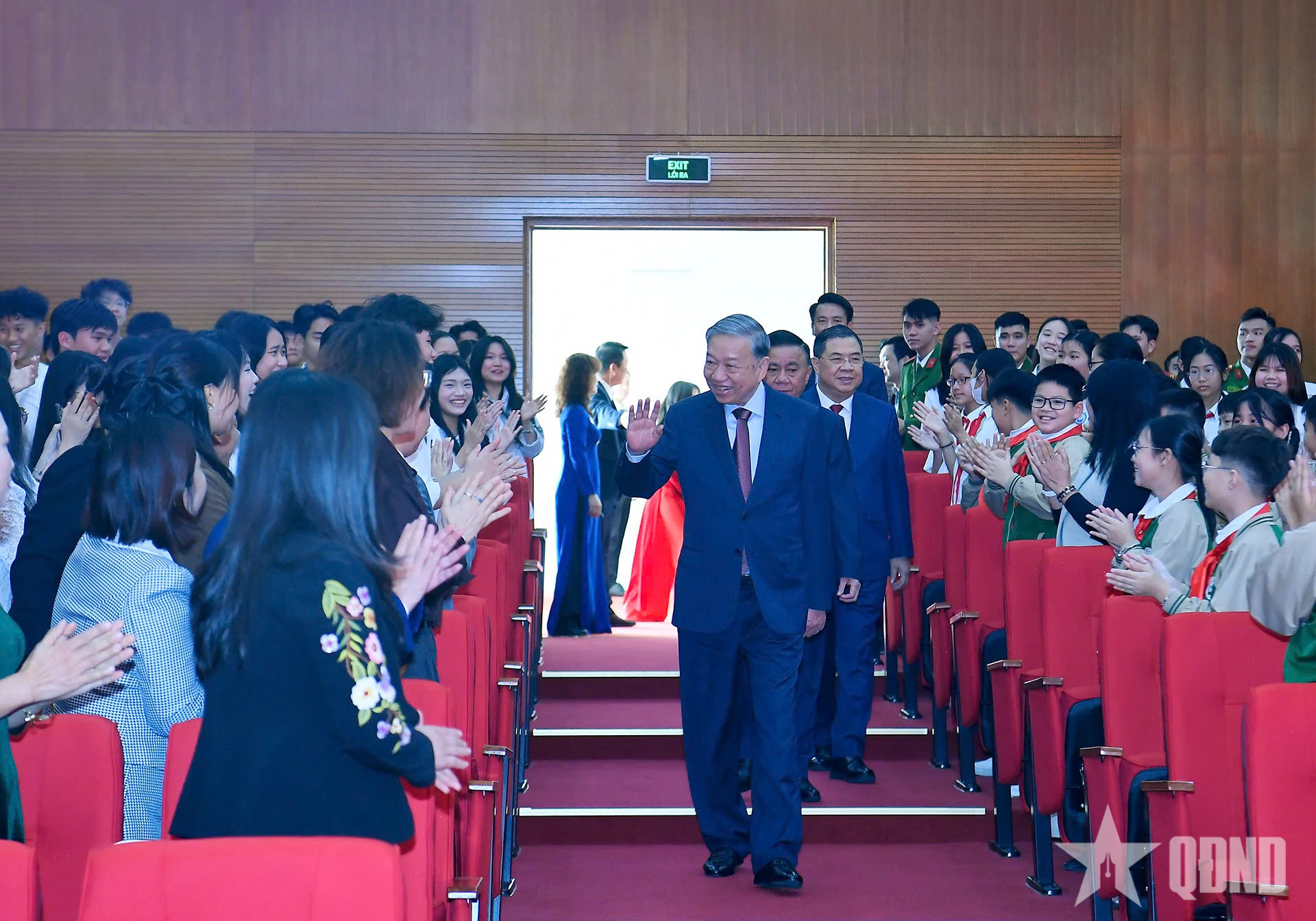 Tổng Bí thư Tô Lâm chụp ảnh cùng các đại biểu dự khai mạc và các cháu học sinh Trường Tiểu học Đại Mỗ 3.