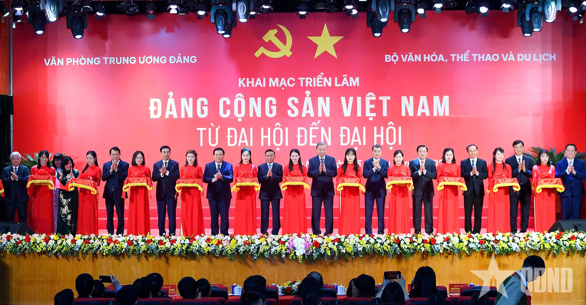 Tổng Bí thư Tô Lâm và các đồng chí lãnh đạo Đảng, Nhà nước cắt băng khai mạc triển lãm.