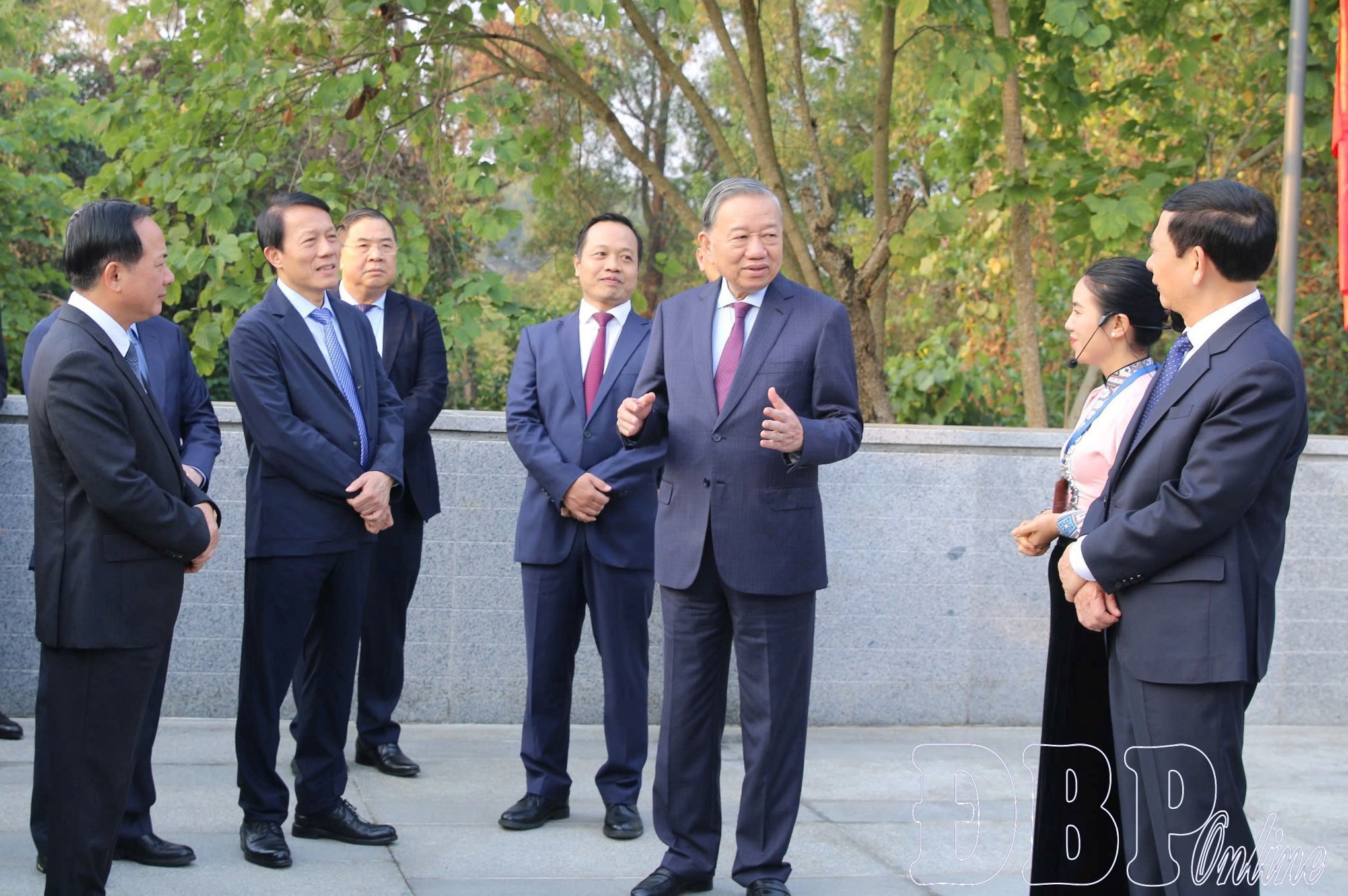 Tổng Bí thư Tô Lâm trao đổi với đại biểu, cán bộ Sở Văn hóa, Thể thao và Du lịch trong khuôn viên Đền thờ Liệt sĩ tại Chiến trường Điện Biên Phủ.