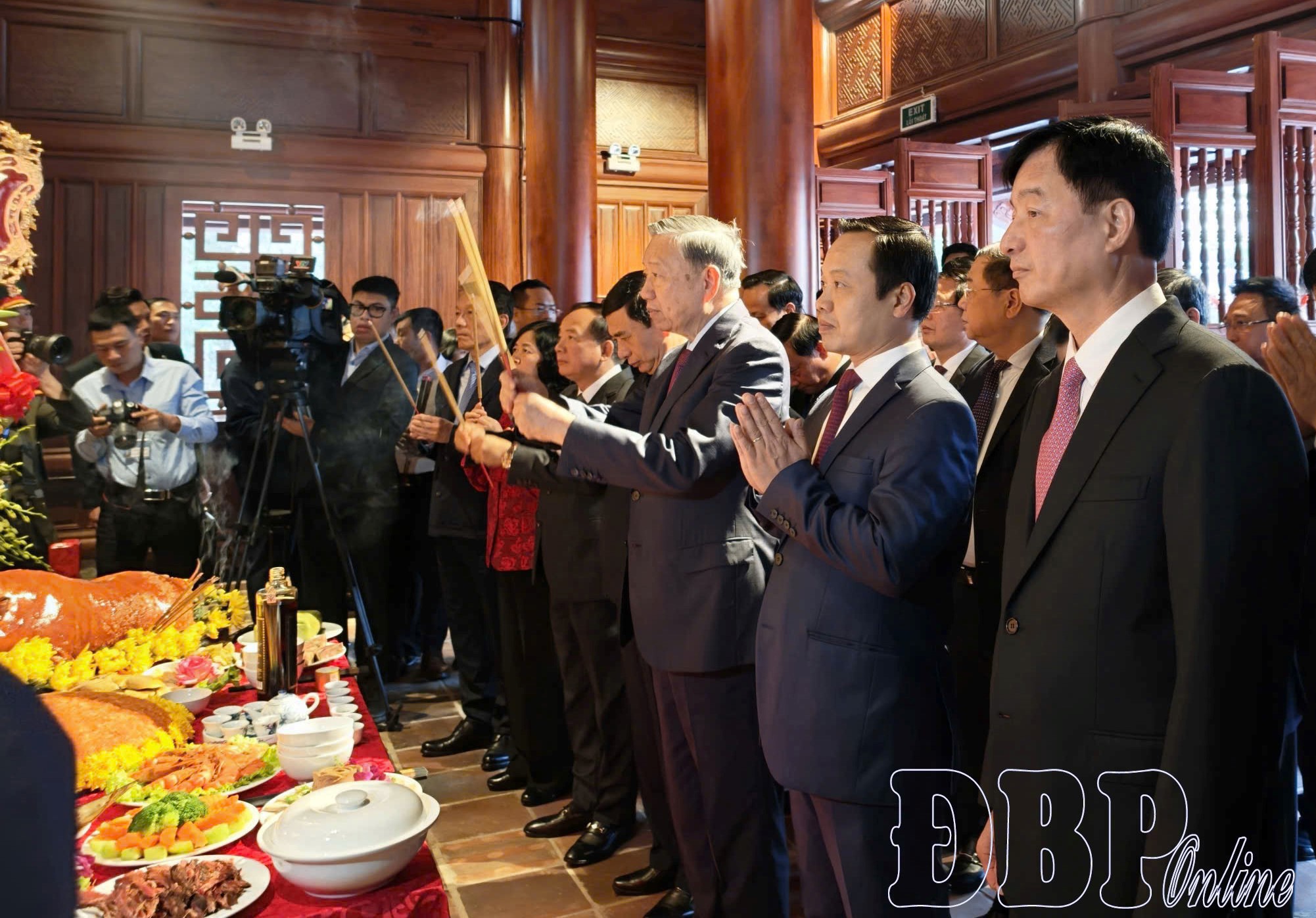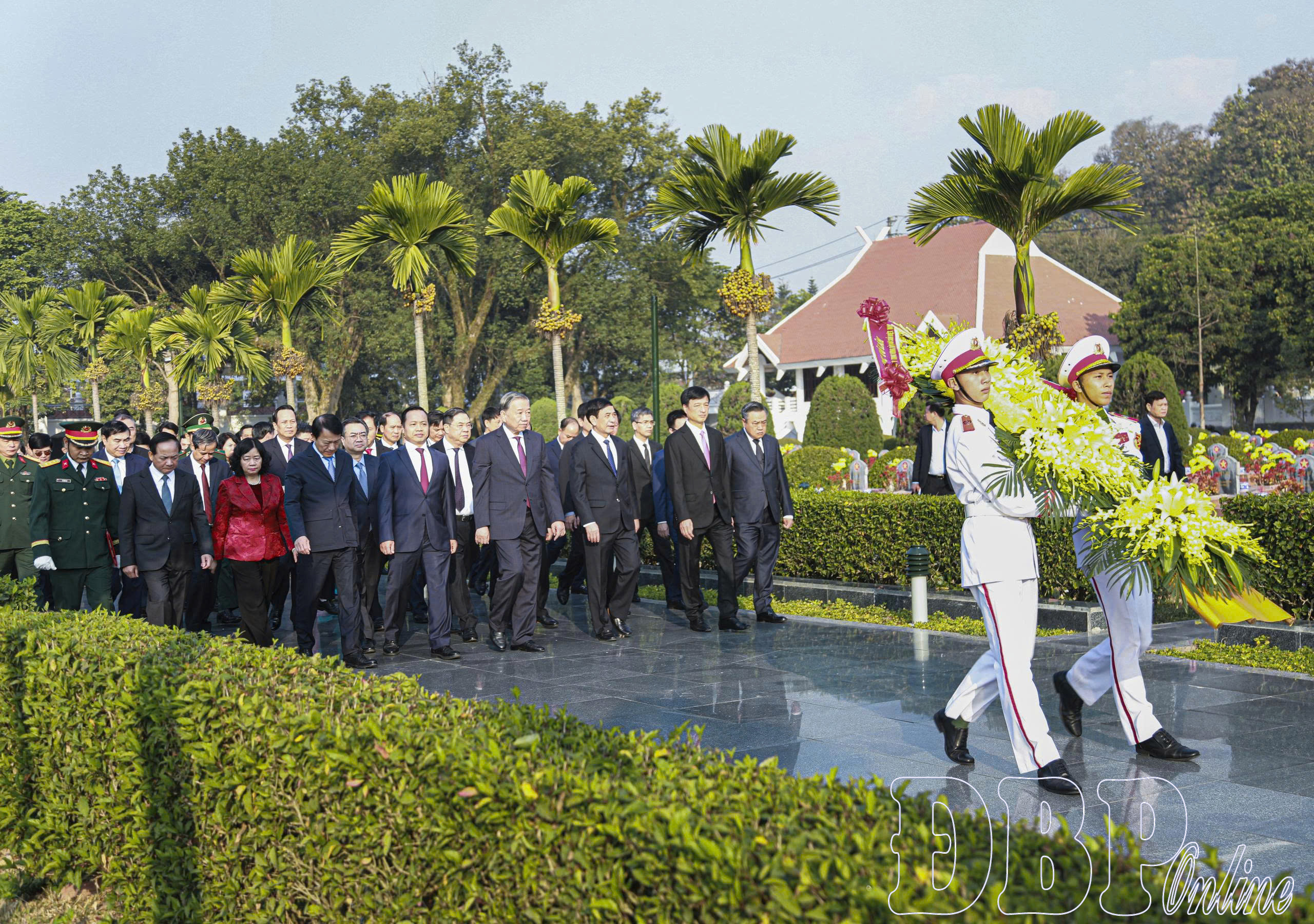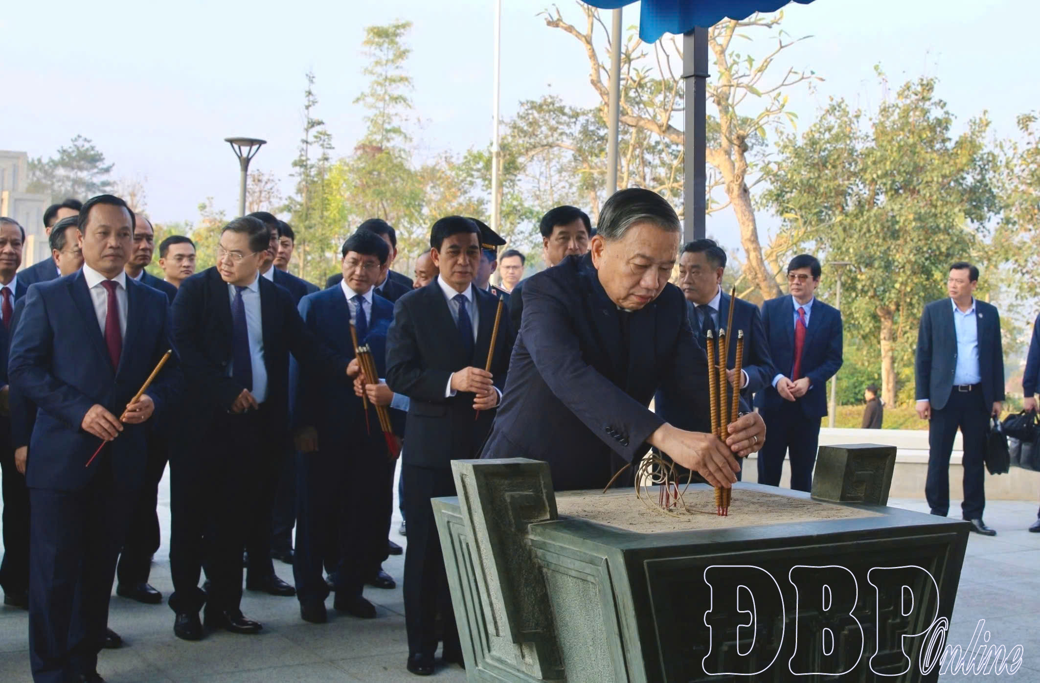 Tổng Bí thư Tô Lâm và đoàn công tác dâng hương Đền thờ Liệt sĩ tại chiến trường Điện Biên Phủ.