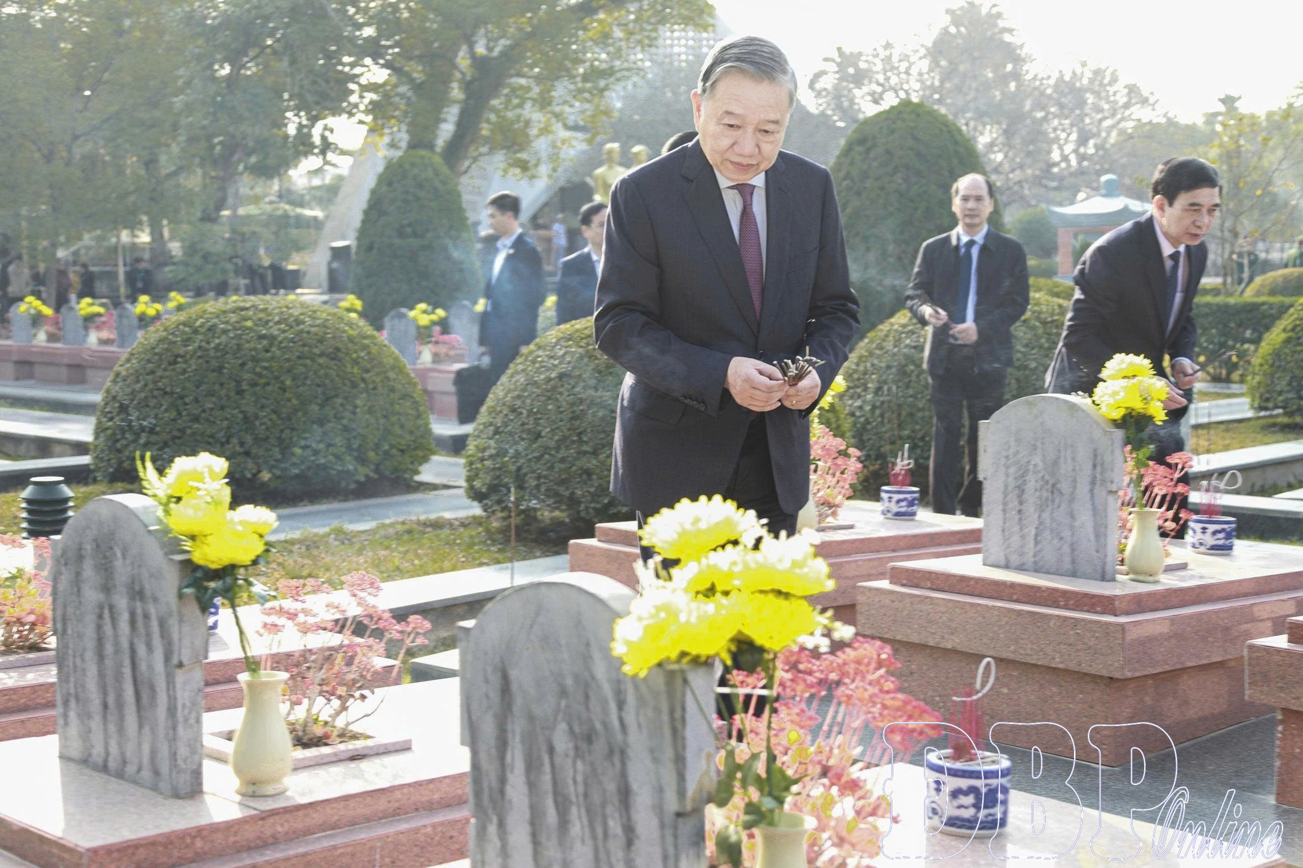 Cũng trong sáng 31/1, Tổng Bí thư Tô Lâm và đoàn công tác đã đến dâng hương Đền thờ Liệt sĩ tại chiến trường Điện Biên Phủ; dâng hoa và thắp hương tri các anh hùng, liệt sĩ tại Nghĩa trang Quốc gia A1.