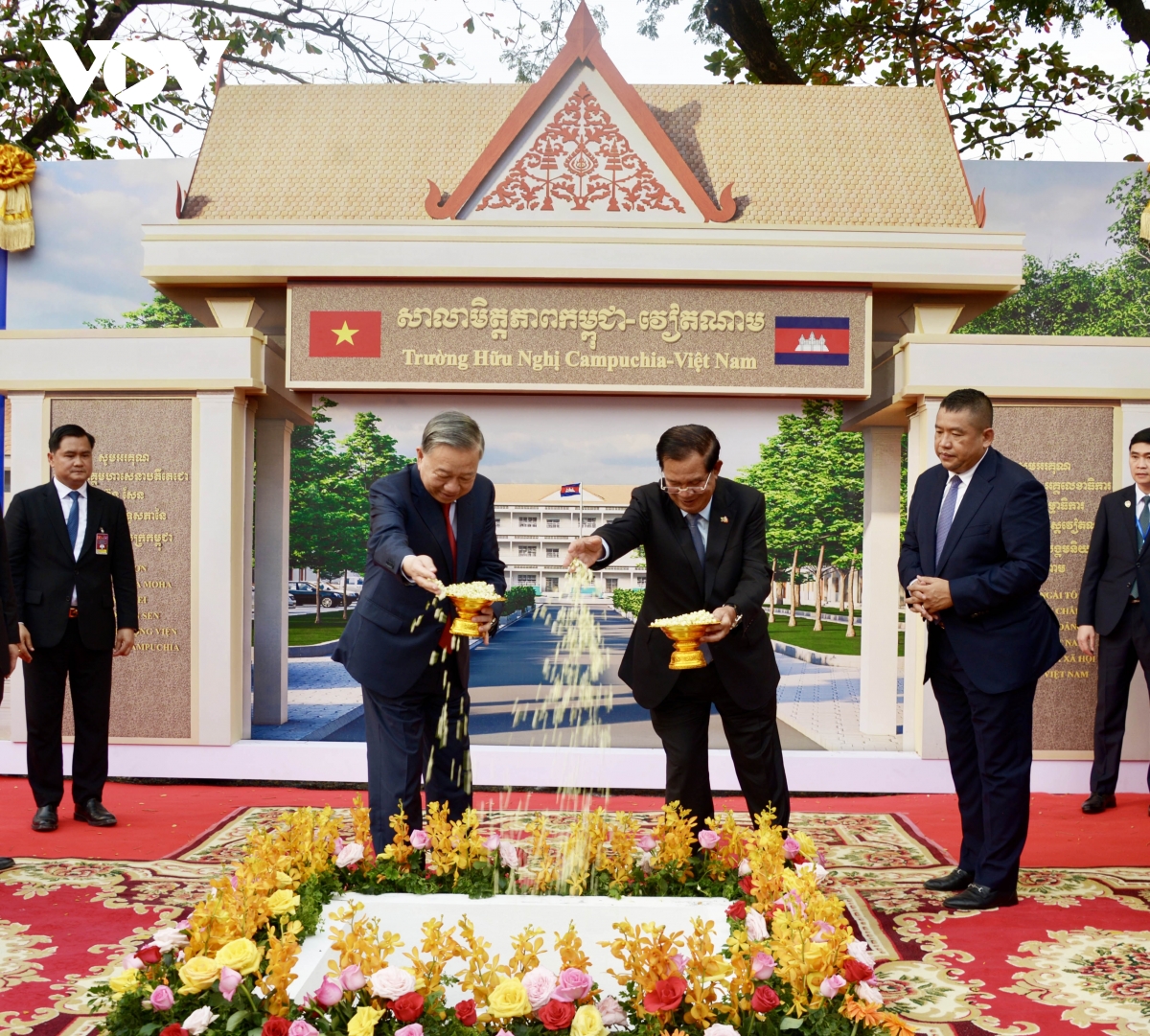 Tại buổi lễ sau khi nghe Đô trưởng Phnom Penh phát biểu chào mừng và thông tin về dự án, Tổng Bí thư Tô Lâm và Chủ tịch CPP Hunsen đã thực hiện nghi lễ động thổ Trường Hữu nghị Campuchia- Việt Nam.