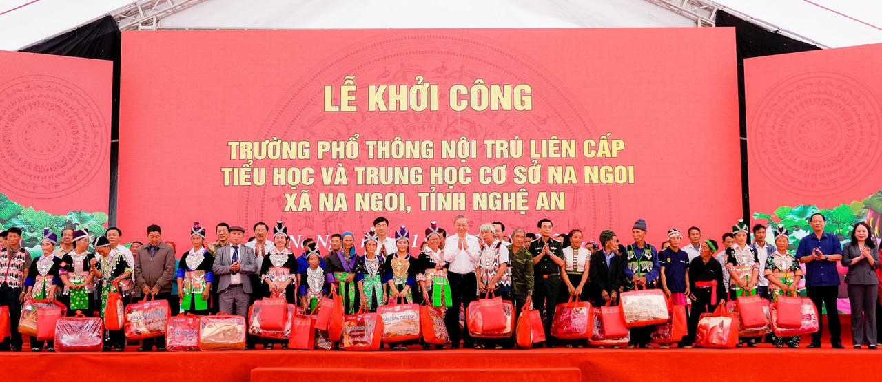 Tổng Bí thư Tô Lâm và các vị lãnh đạo Đảng, Nhà nước, lãnh đạo bộ, ngành Trung ương và tỉnh Nghệ An dự lễ khởi công xây dựng Trường Phổ thông nội trú liên cấp Tiểu học và Trung học cơ sở Na Ngoi, tỉnh Nghệ An. Ảnh: PB