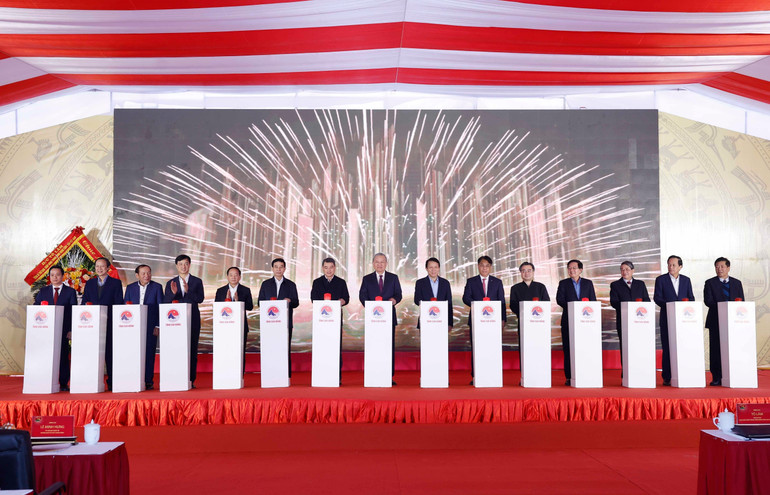 Tổng Bí thư Tô Lâm cùng các đại biểu thực hiện nghi thức khởi công xây dựng công trình Trường Phổ thông nội trú Tiểu học và Trung học Cơ sở Trường Hà. (Ảnh: TTXVN)