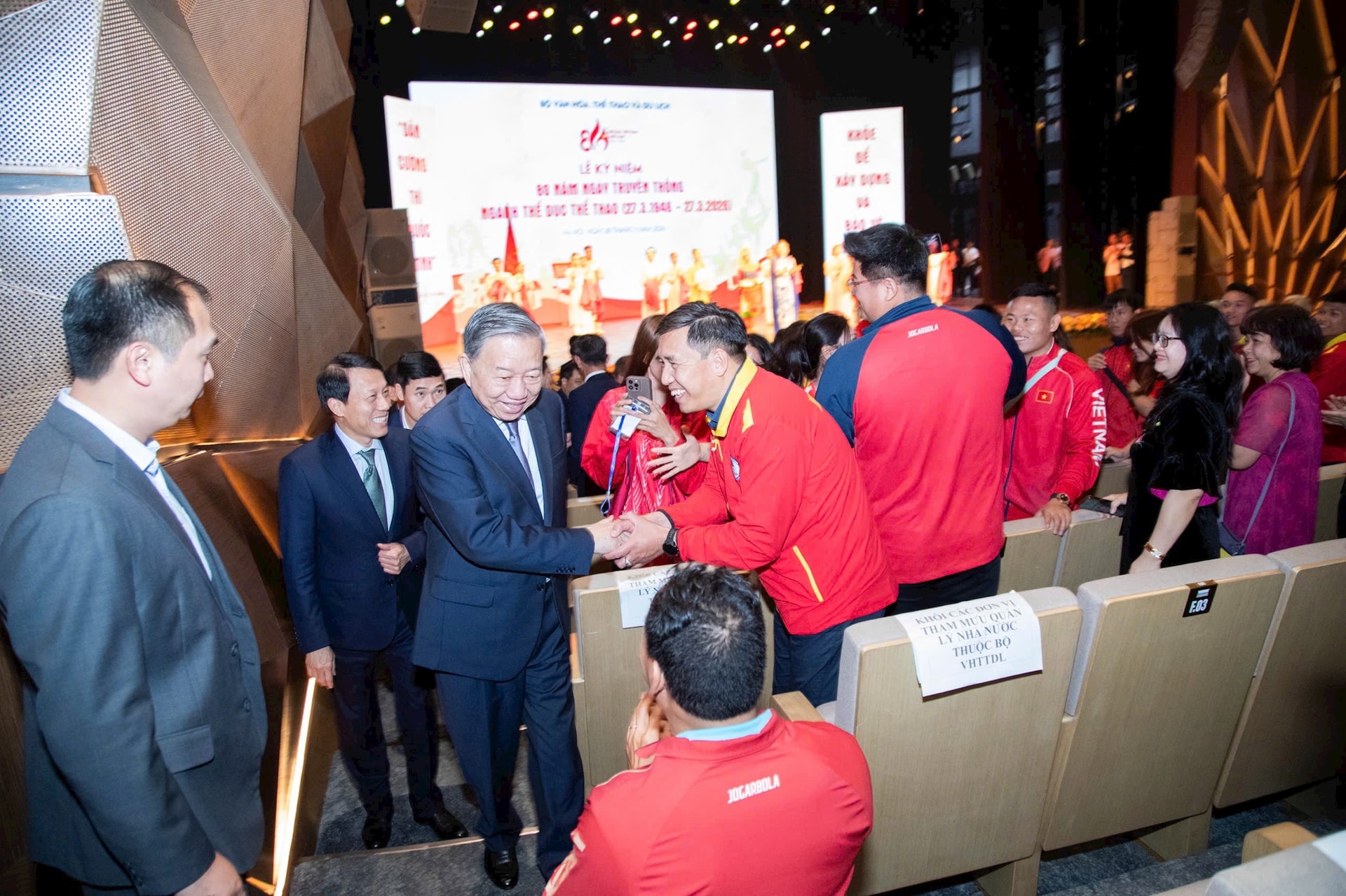Tổng Bí thư Tô Lâm thăm hỏi các vận động viên, huấn luyện viên tại buổi lễ. Ảnh: Ngọc Tú