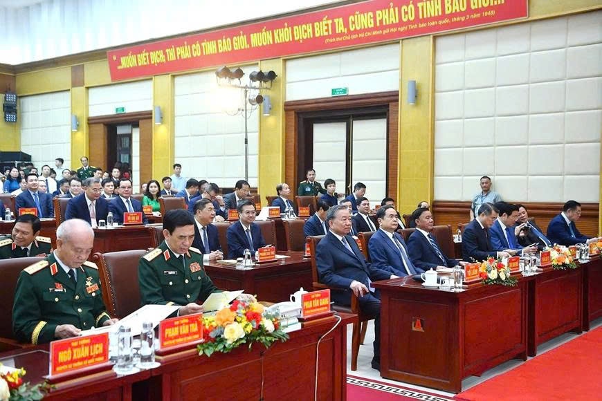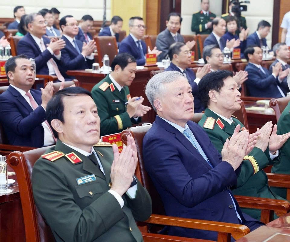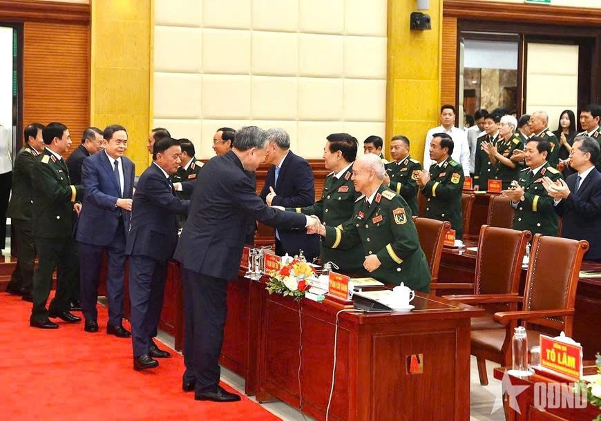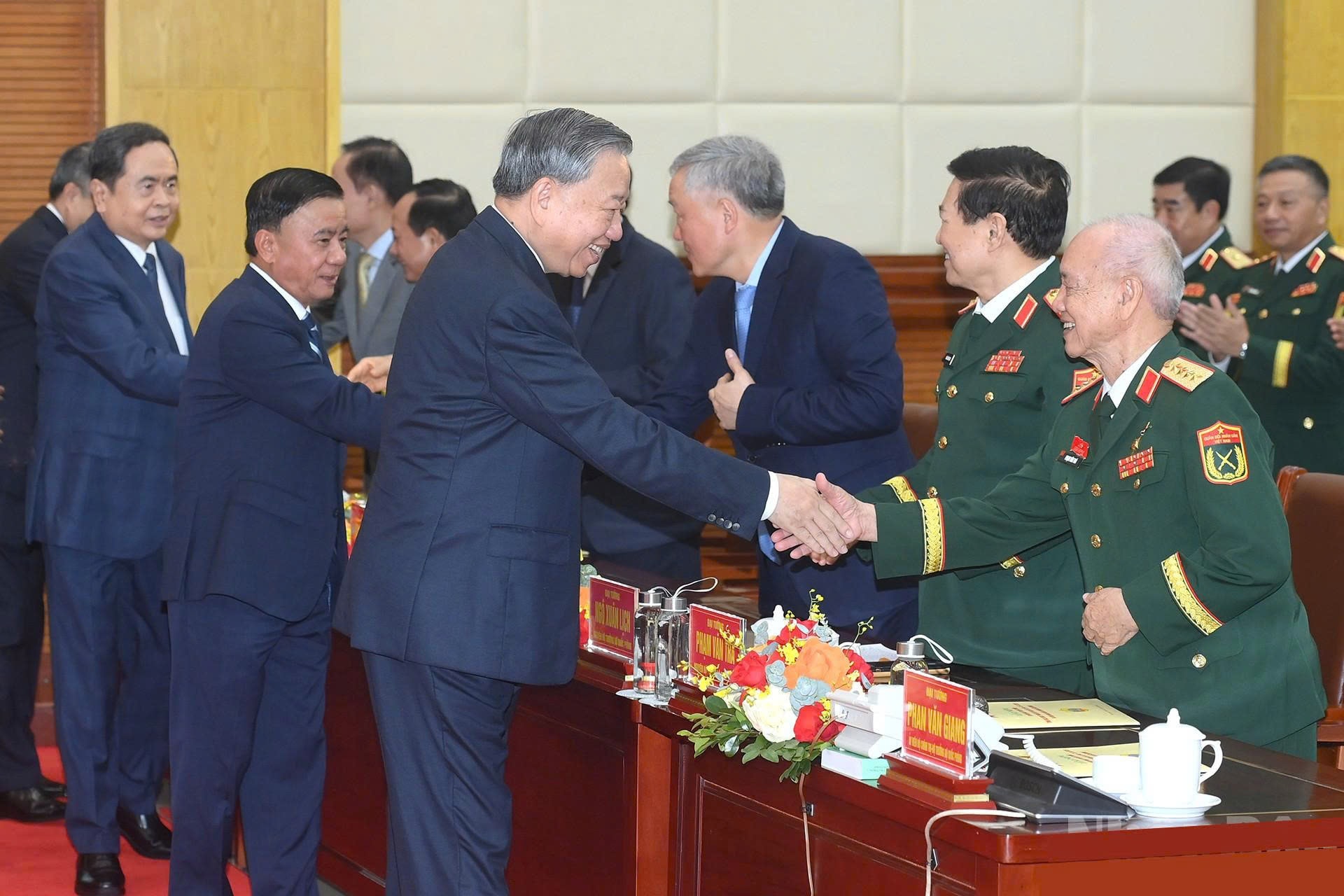 Tổng Bí thư Tô Lâm, Bí thư Quân ủy Trung ương; Chủ tịch Quốc hội Trần Thanh Mẫn với các đại biểu dự Lễ kỷ niệm. Ảnh: qdnd.vn