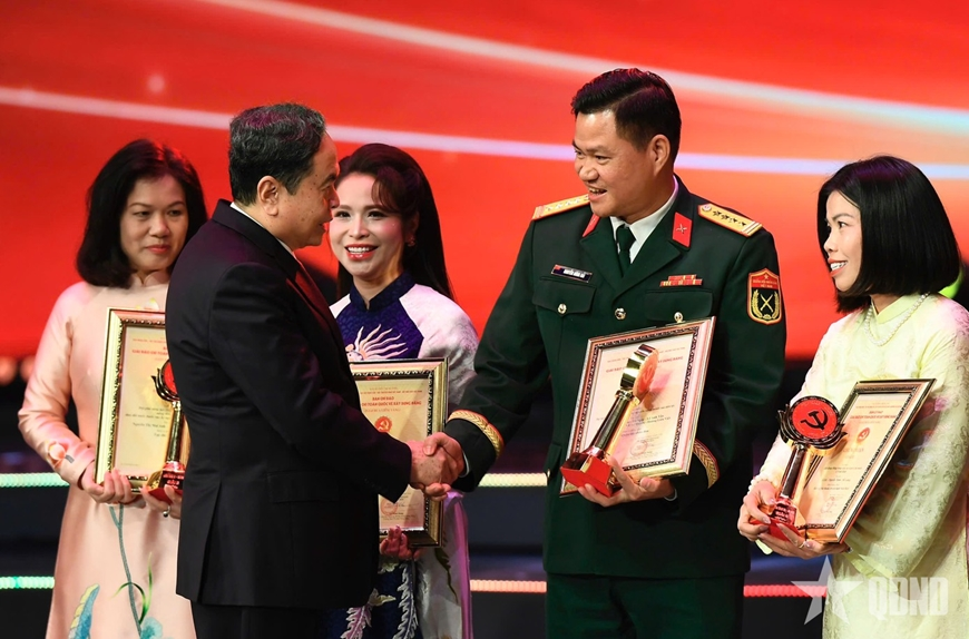 Chủ tịch Quốc hội Trần Thanh Mẫn và Thường trực Ban Bí thư Trần Cẩm Tú trao giải B tặng đại diện nhóm tác giả của Báo Quân đội nhân dân.