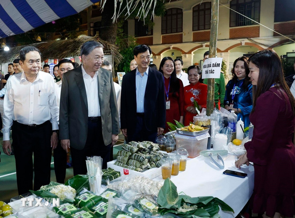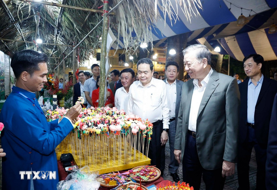 Tổng Bí thư Tô Lâm, Chủ tịch Quốc hội Trần Thanh Mẫn, Thường trực Ban Bí thư Trần Cẩm Tú và đại biểu thăm các gian hàng OCOP. (Ảnh: Thống Nhất/TTXVN)
