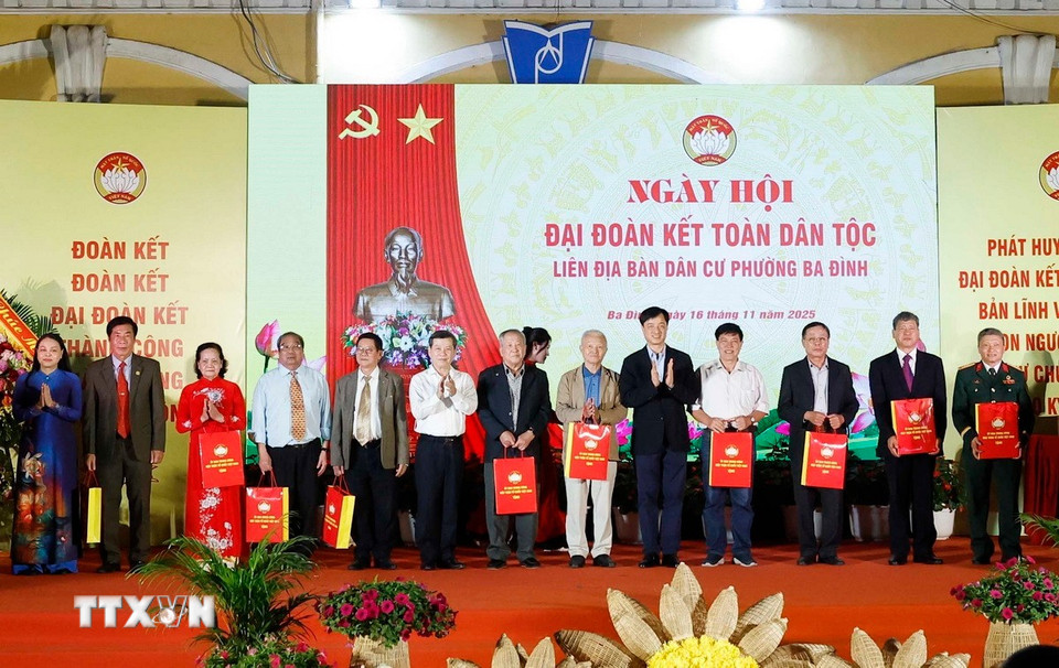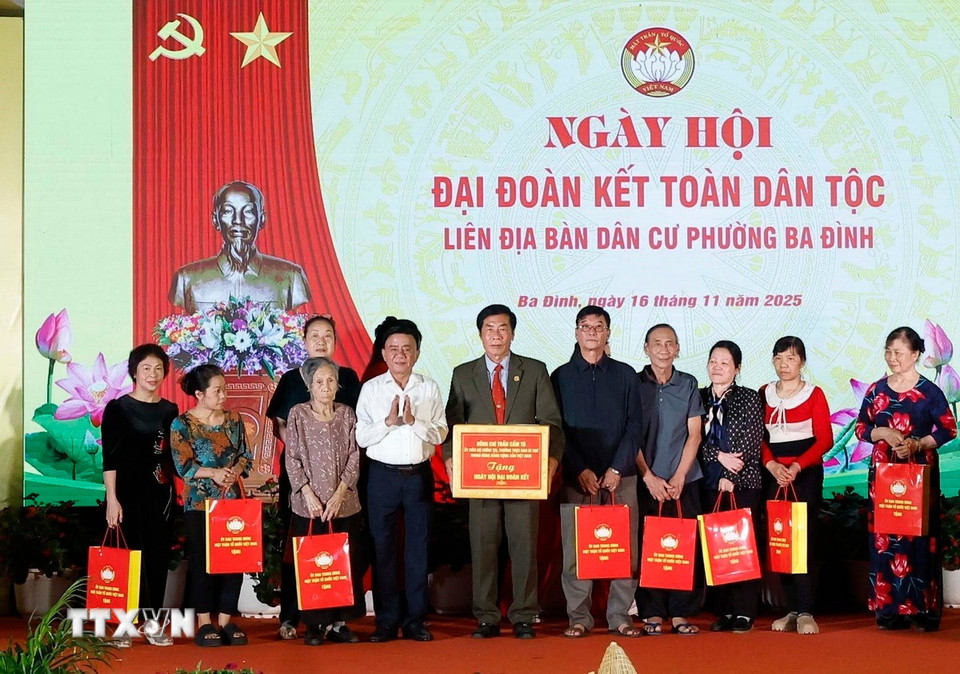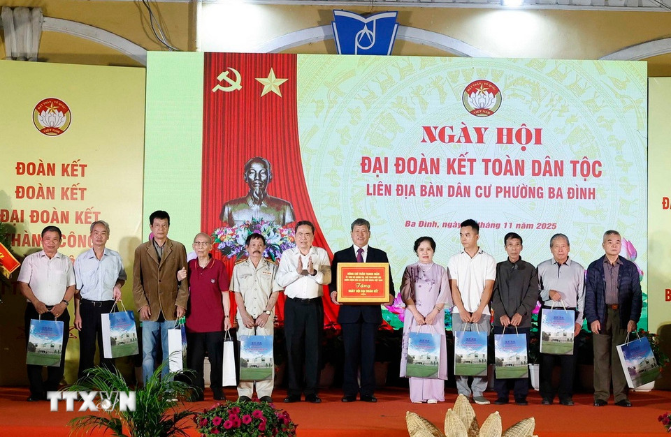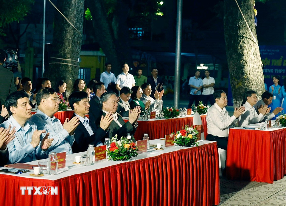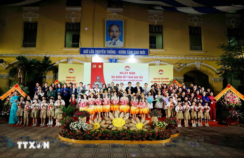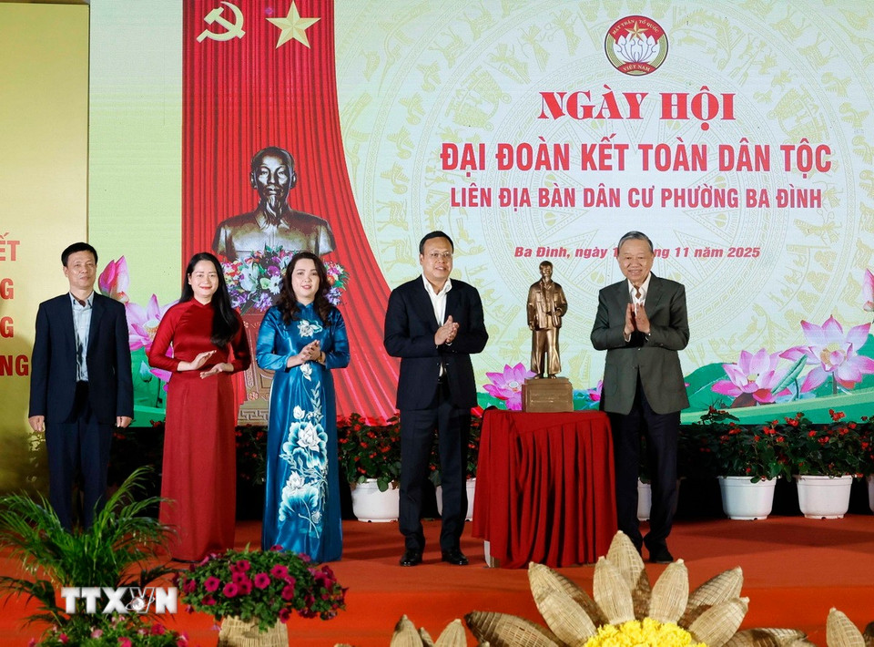 Tổng Bí thư Tô Lâm, Chủ tịch Quốc hội Trần Thanh Mẫn, Thường trực Ban Bí thư Trần Cẩm Tú và các đại biểu dự Ngày hội Đại đoàn kết toàn dân tộc tại liên địa bàn dân cư Phường Ba Đình, Hà Nội. (Ảnh: Thống Nhất/TTXVN)