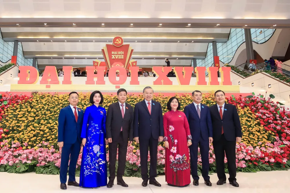 Tổng Bí thư Tô Lâm và các đại biểu dự Đại hội Đảng bộ TP Hà Nội lần thứ XVIII chụp ảnh lưu niệm cùng lãnh đạo TP Hà Nội. Ảnh: Thắng Hữu.