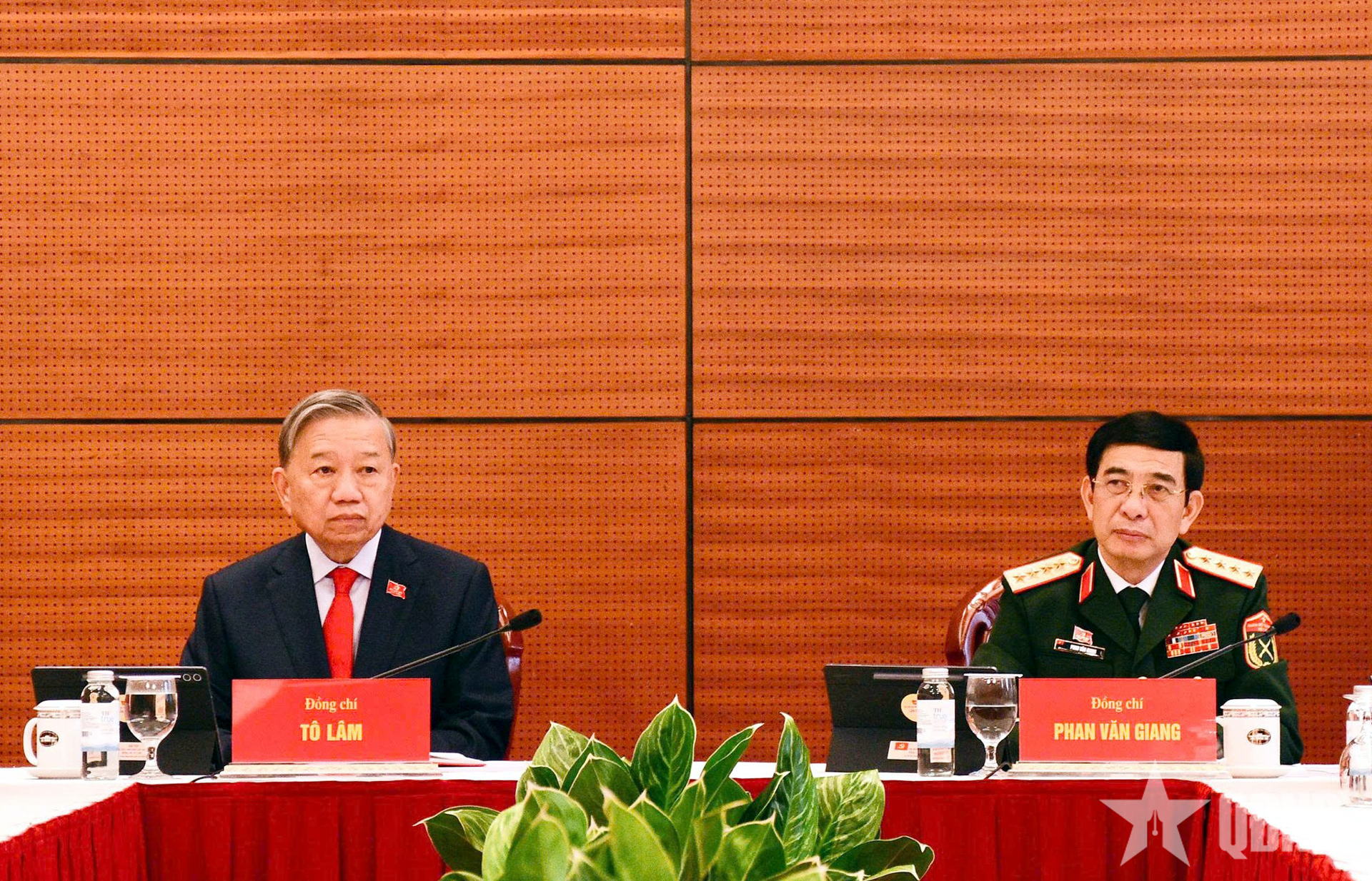 Tổng Bí thư Tô Lâm và Đại tướng Phan Văn Giang, Ủy viên Bộ Chính trị, Phó bí thư Quân ủy Trung ương, Bộ trưởng Bộ Quốc phòng lắng nghe ý kiến thảo luận của các đại biểu trong đoàn.